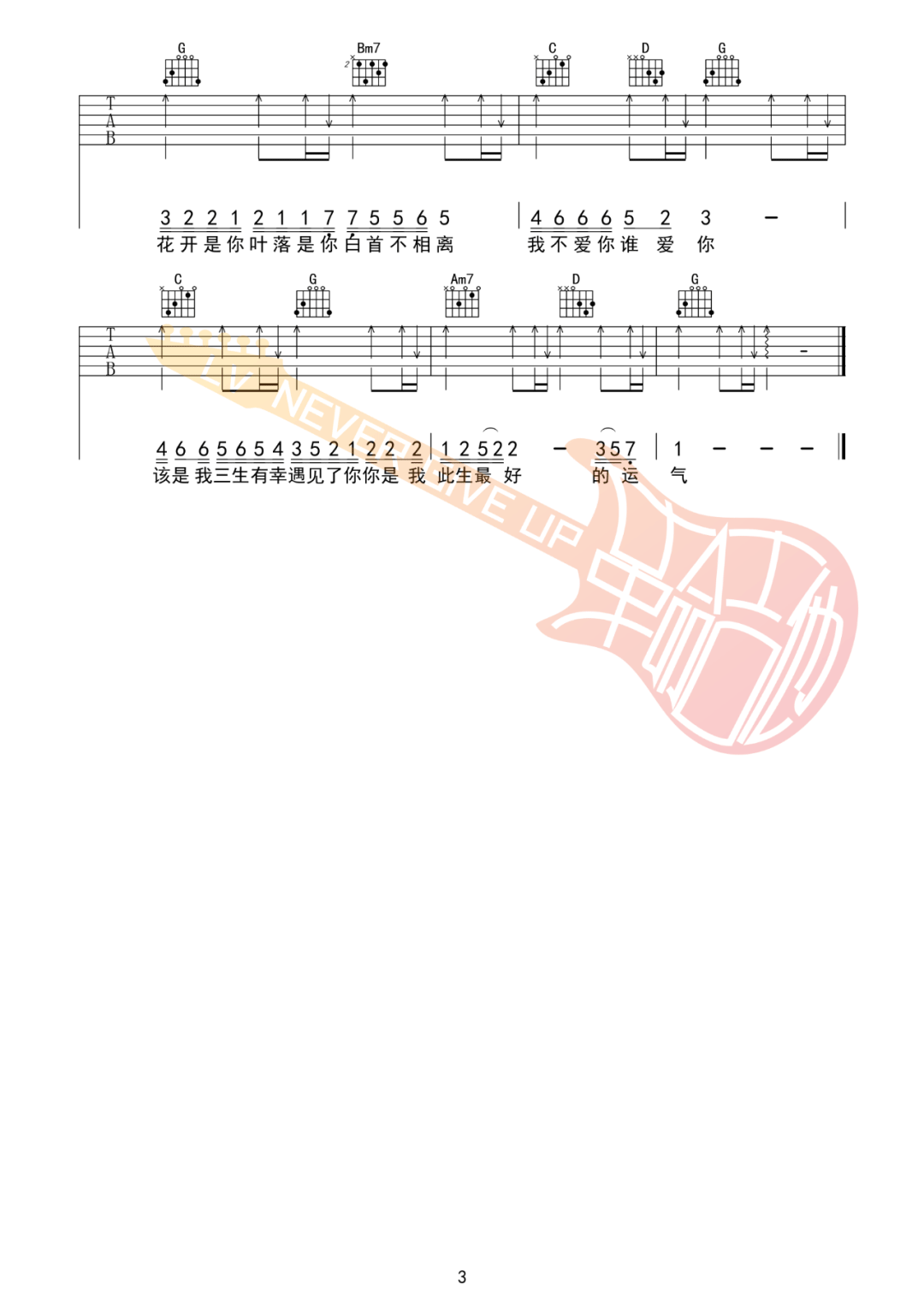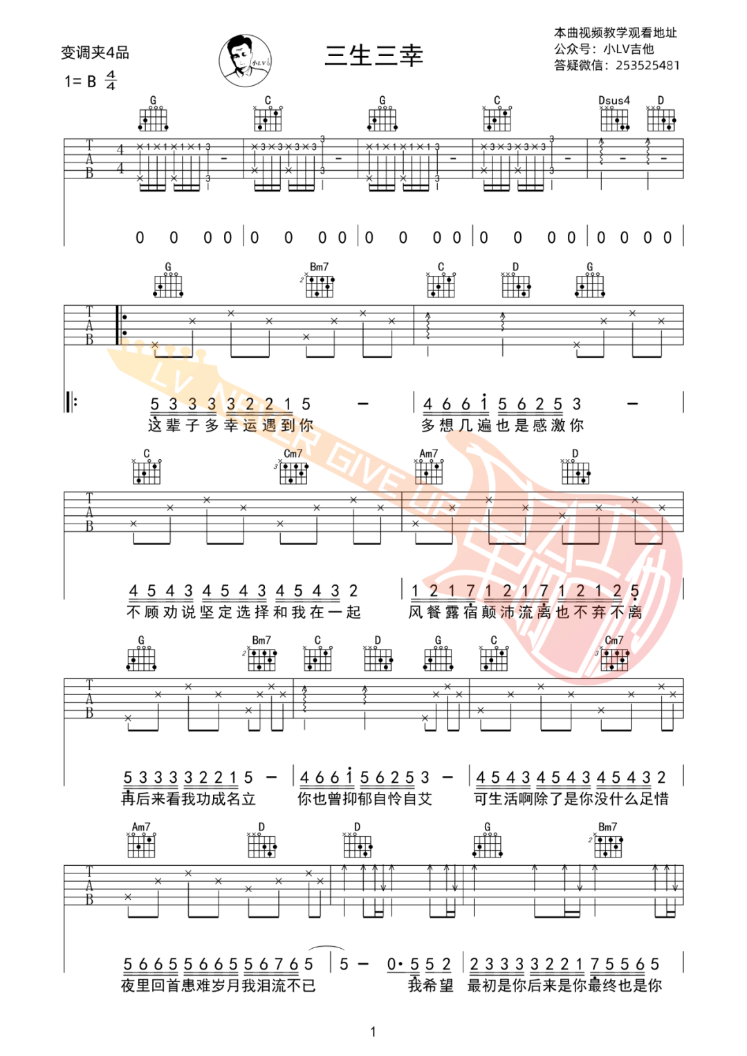 曲谱介绍: 吉他谱介绍:三生三幸吉他谱,海来阿木演唱的一首歌曲,4/4拍的节奏,这首歌曲的原调为B调,这里曲谱采用了G调指法进行编配,演唱时夹变调夹4品可回到原调,也可根据个人实际嗓音情况选择。曲谱由琴谱网更新上传,共3张高清图片弹唱吉他谱例,来源于@革命吉他编配出品。这首歌是海来阿木为自己的婚姻写的一首歌曲,从一开始的一无所有不顾父母反对在一起,在出租屋里给爱人用硬纸壳扇扇子,到后面事业有所起色后无法家庭事业兼顾,直到现在相依相伴约定白首不相离。