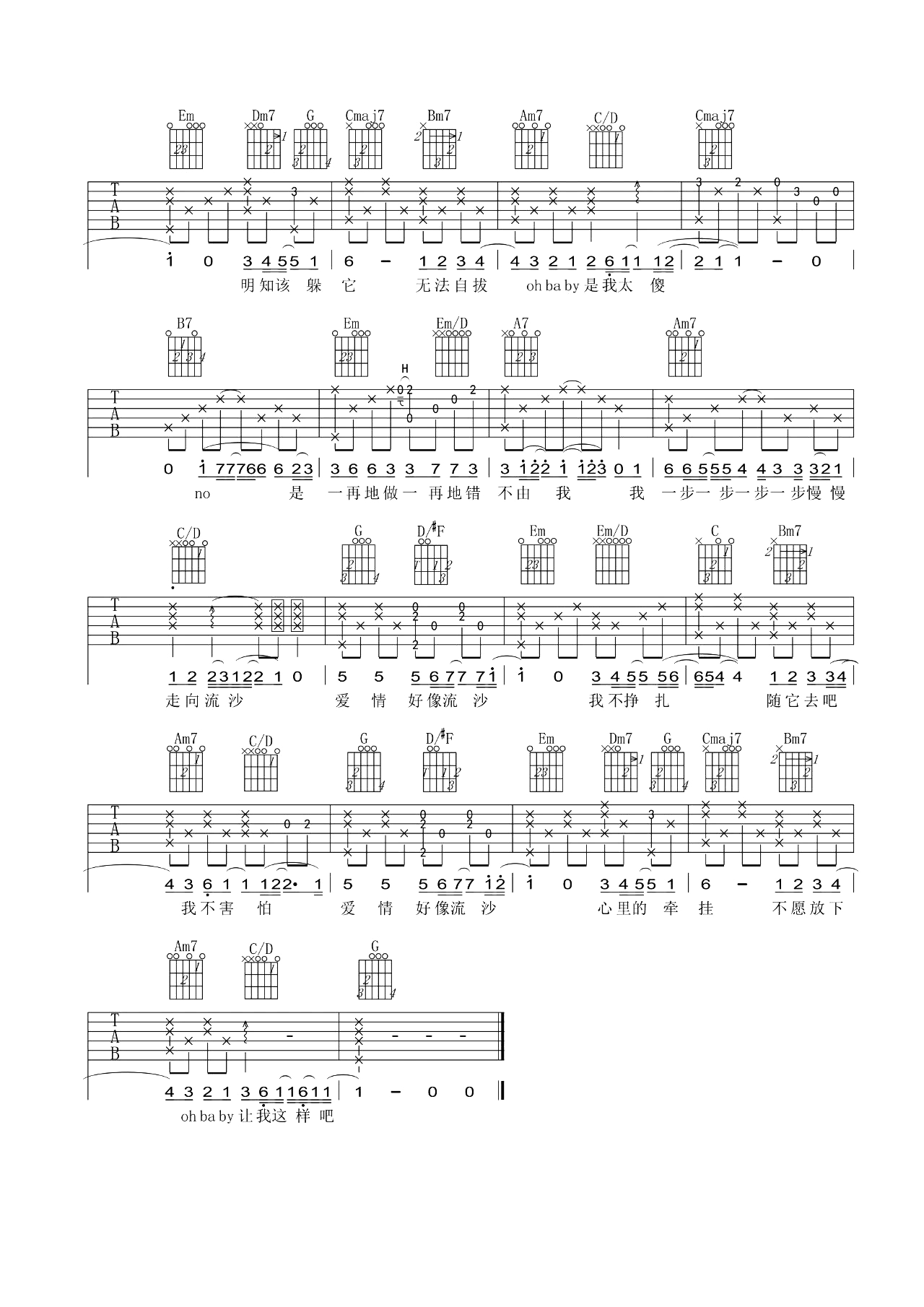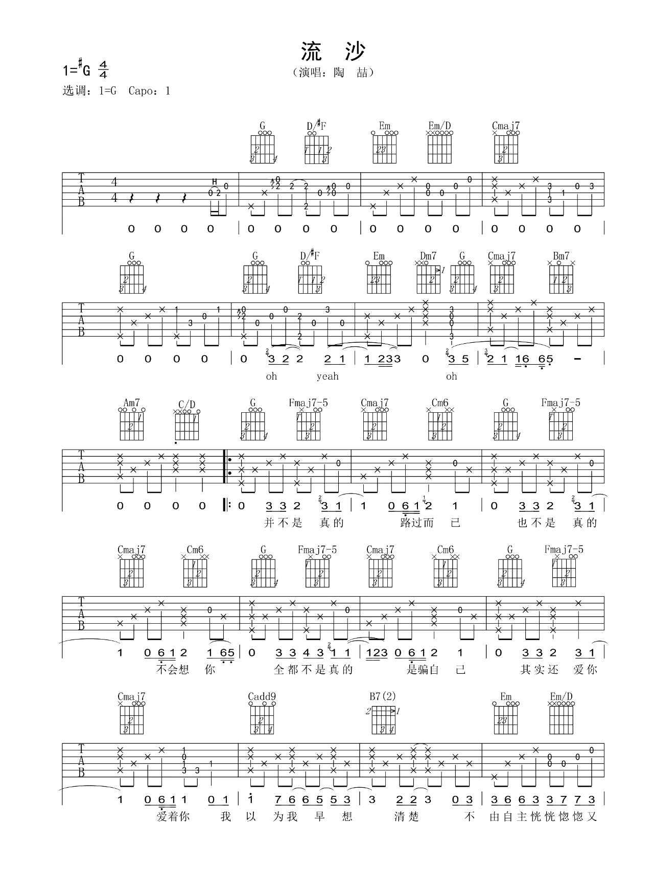 曲谱介绍: 吉他谱介绍:流沙吉他谱,陶喆演唱的一首歌曲,4/4拍的节奏,这首歌曲的原调为降A调,这里曲谱采用了G调指法进行编配,演唱时夹变调夹1品可回到原调,也可根据个人实际嗓音情况选择。曲谱由琴谱网更新上传,共3张高清图片弹唱吉他谱例,曲谱来源于网络转载,编配制谱者暂不详。