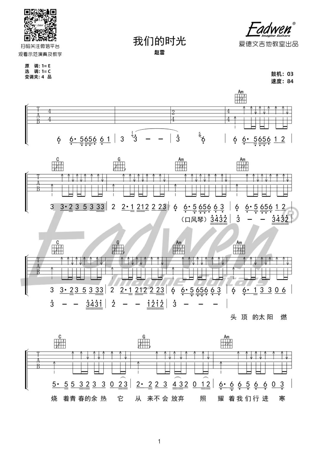 曲谱介绍: 吉他谱介绍:我们的时光吉他谱,赵雷演唱的一首歌曲,4/4拍的节奏,这首歌曲的原调为E调,这里曲谱采用了C调指法进行编配,演唱时夹变调夹4品可回到原调,也可根据个人实际嗓音情况选择。曲谱由琴谱网更新上传,共5张高清图片弹唱吉他谱例,来源于@爱德文吉他教室编配出品。