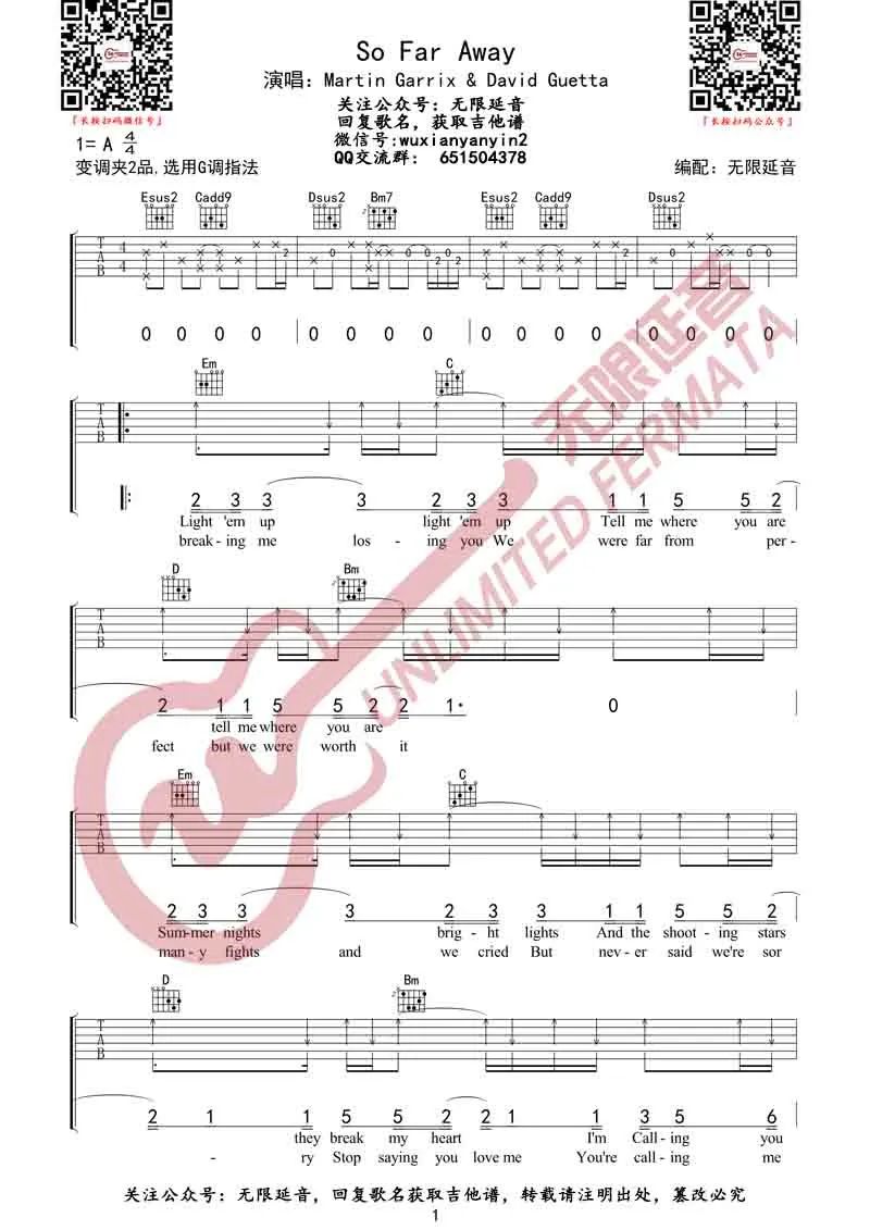 曲谱介绍: 吉他谱介绍:So-Far-Away吉他谱,Martin Garrix演唱的一首歌曲,4/4拍的节奏,这首歌曲的原调为A调,这里曲谱采用了G调指法进行编配,演唱时夹变调夹2品可回到原调,也可根据个人实际嗓音情况选择。曲谱由琴谱网更新上传,共4张高清图片弹唱吉他谱例,来源于@无限延音编配出品。一首治愈电音,节奏感与柔美清新相结合,融入混音而极具空间感和层次感,搭配美妙绝伦的男女声,震撼心灵。
