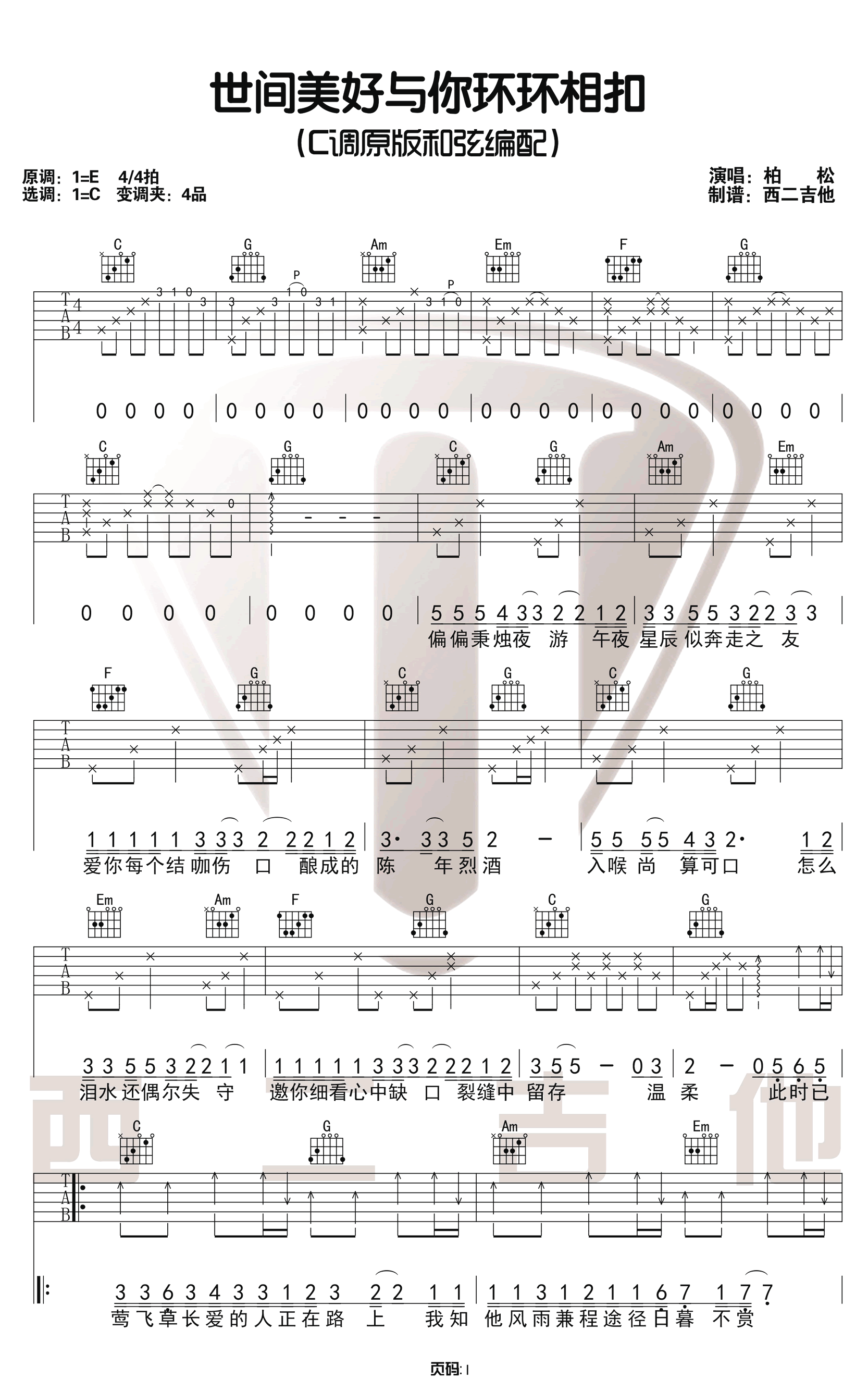 曲谱介绍: 吉他谱介绍:世间美好与你环环相扣吉他谱,柏松演唱的一首歌曲,4/4拍的节奏,这首歌曲的原调为E调,这里曲谱采用了C调指法进行编配,演唱时夹变调夹4品可回到原调,也可根据个人实际嗓音情况选择。曲谱由琴谱网更新上传,共3张高清图片弹唱吉他谱例,来源于@山山吉他编配出品。