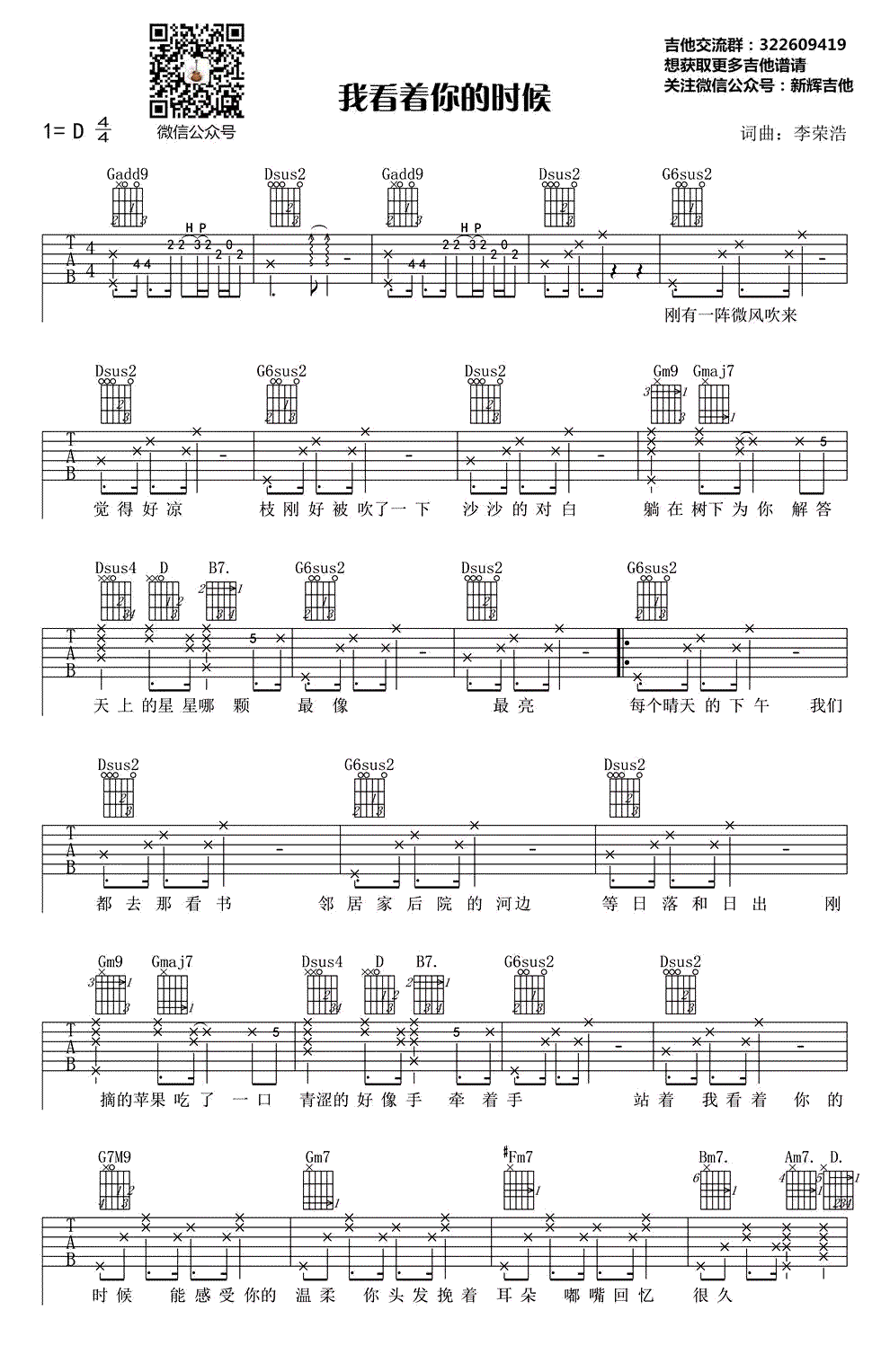 曲谱介绍: 吉他谱介绍:我看着你的时候吉他谱,李荣浩演唱的一首歌曲,4/4拍的节奏,这首歌曲的原调为D调,这里曲谱采用了D调指法进行编配,演唱时可不夹变调夹,曲谱由琴谱网更新上传,共2张高清图片弹唱吉他谱例,来源于@新辉吉他编配出品。歌曲主旋律是轻缓的,男低音的温柔和男中音抒情都被荣以浩特别的方式演绎出来。