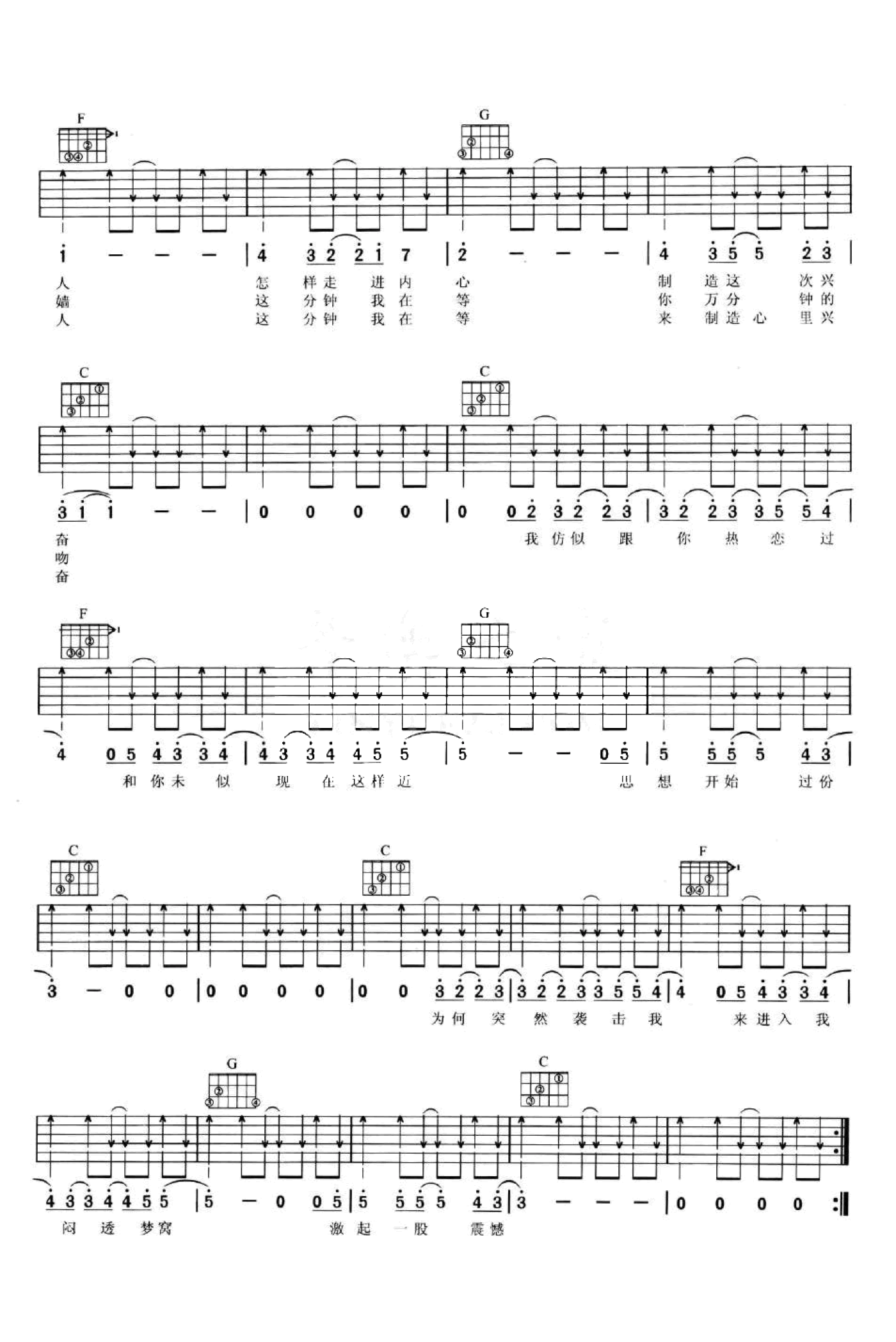 曲谱介绍: 吉他谱介绍:梦中人吉他谱,王菲演唱的一首歌曲,4/4拍的节奏,这首歌曲的原调为C调,这里曲谱采用了C调指法进行编配,演唱时可不夹变调夹,曲谱由琴谱网更新上传,共2张高清图片弹唱吉他谱例,曲谱来源于网络转载,编配制谱者暂不详。这首歌有一梦惊醒后立于高山之巅风头之上的淋漓快感,歌曲奔放的旋律配合王菲的欢快舞步,那分明演绎了一个初恋中的女孩,矜持而兴奋、害羞而幸福