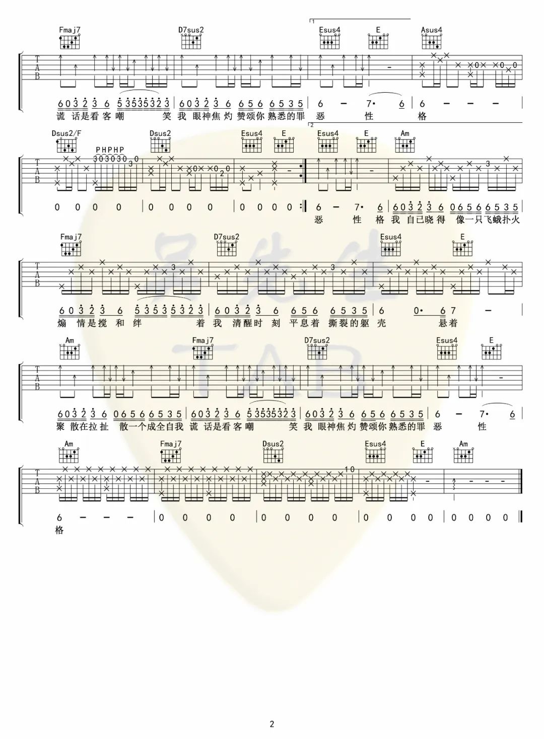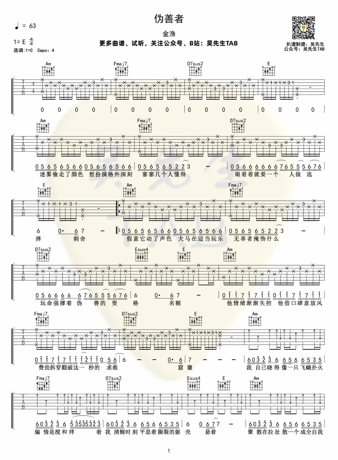 曲谱介绍: 吉他谱介绍:伪善者吉他谱,金渔演唱的一首歌曲,4/4拍的节奏,这首歌曲的原调为E调,这里曲谱采用了C调指法进行编配,演唱时夹变调夹4品可回到原调,也可根据个人实际嗓音情况选择。曲谱由琴谱网更新上传,共2张高清图片弹唱吉他谱例,来源于@吴先生TAB编配出品。