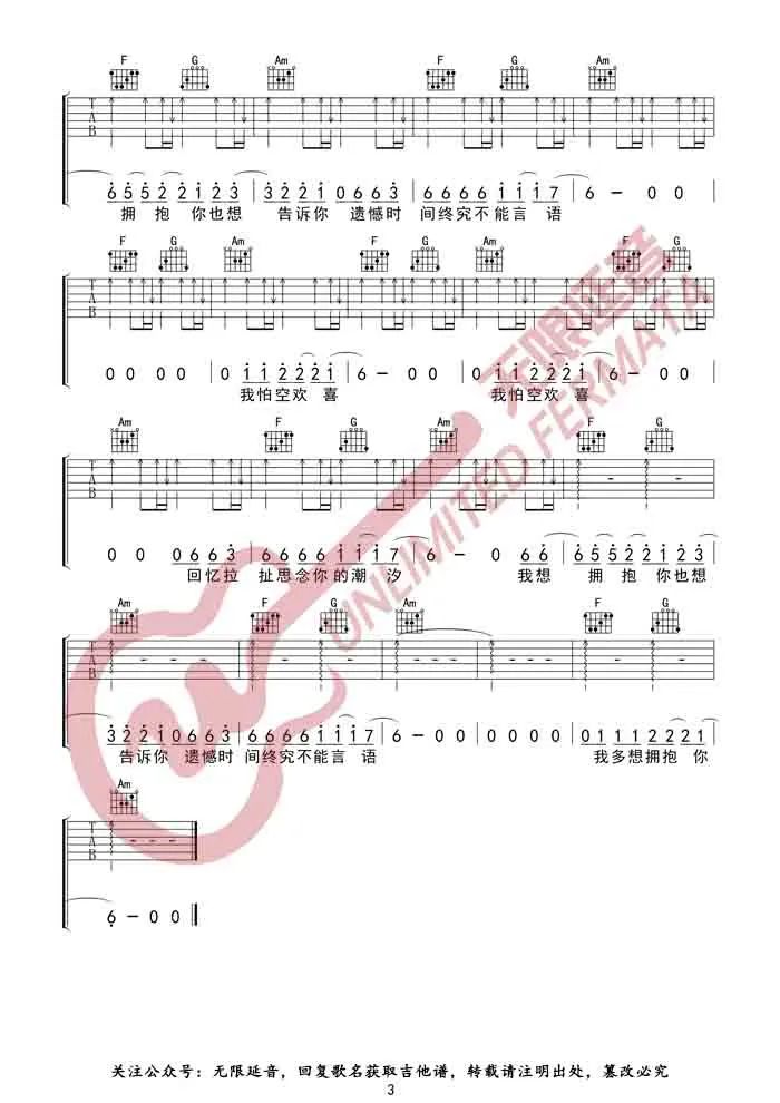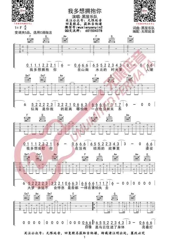 曲谱介绍: 吉他谱介绍:我多想拥抱你吉他谱,黑屋乐队演唱的一首歌曲,4/4拍的节奏,这首歌曲的原调为F调,这里曲谱采用了C调指法进行编配,演唱时夹变调夹5品可回到原调,也可根据个人实际嗓音情况选择。曲谱由琴谱网更新上传,共3张高清图片弹唱吉他谱例,来源于@无限延音编配出品。