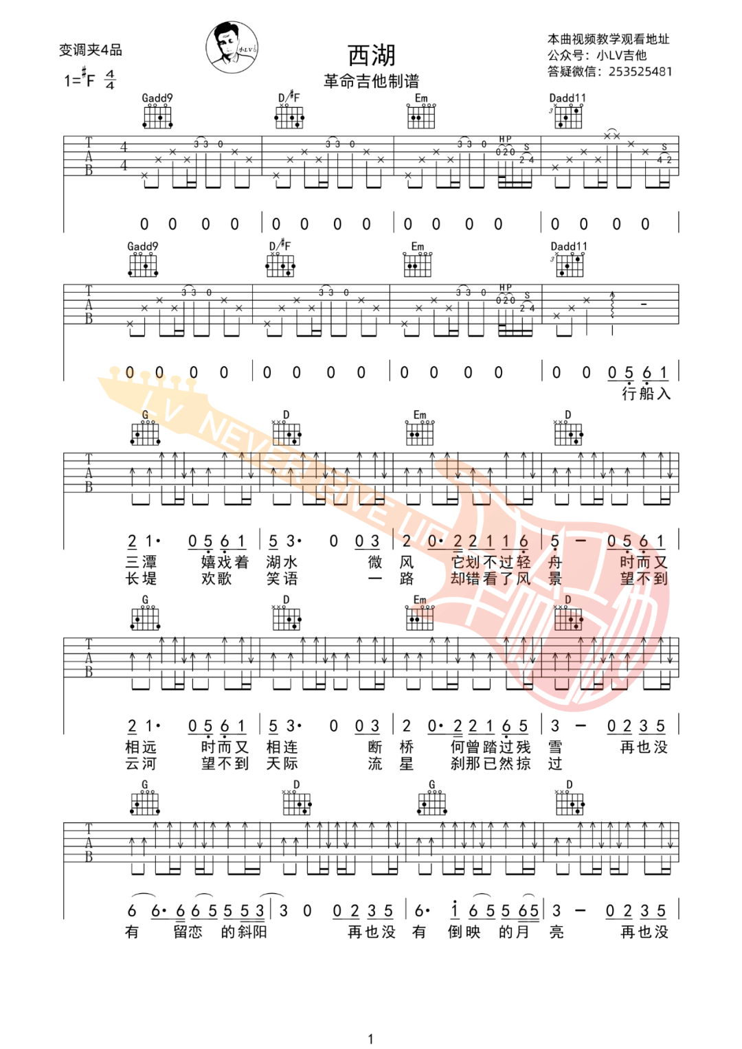 曲谱介绍: 吉他谱介绍:西湖吉他谱,痛仰乐队演唱的一首歌曲,4/4拍的节奏,这首歌曲的原调为#F调,这里曲谱采用了G调指法进行编配,演唱时夹变调夹可回到原调,也可根据个人实际嗓音情况选择。曲谱由琴谱网更新上传,共2张高清图片弹唱吉他谱例,来源于@革命吉他编配出品。这首歌曲风清新,就像漫步在西湖湖畔,被醉人的暖风吹佛,尤其是中间的吉他solo,十分动听,弹出了古典乐器的味道,特色鲜明,非常符合歌曲的主题意境。
