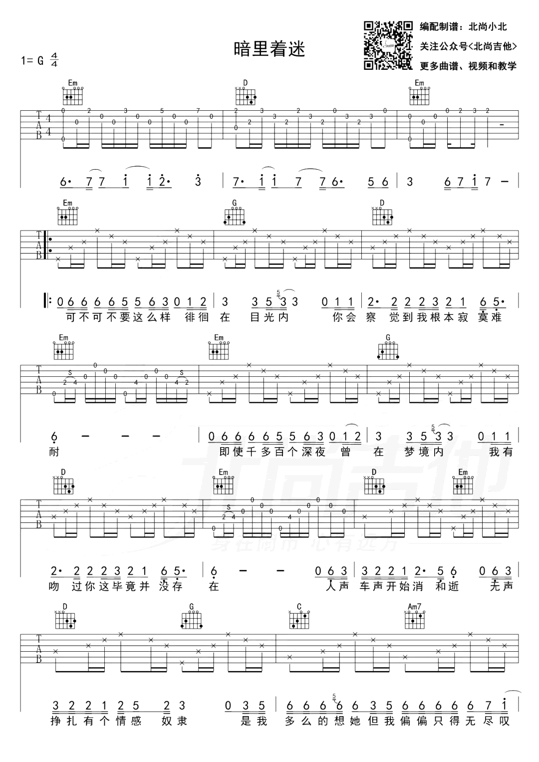 曲谱介绍: 吉他谱介绍:暗里着迷吉他谱,刘德华演唱的一首歌曲,4/4拍的节奏,这首歌曲的原调为降E调,这里曲谱采用了G调指法进行编配,演唱时可根据个人情况选择变调夹,曲谱由琴谱网更新上传,共2张高清图片弹唱吉他谱例,来源于@北尚吉他编配出品。这首歌被华仔称为是自己半生非常重要的歌,在歌词的字里行间透露着对某个人的深深的无言的爱恋。