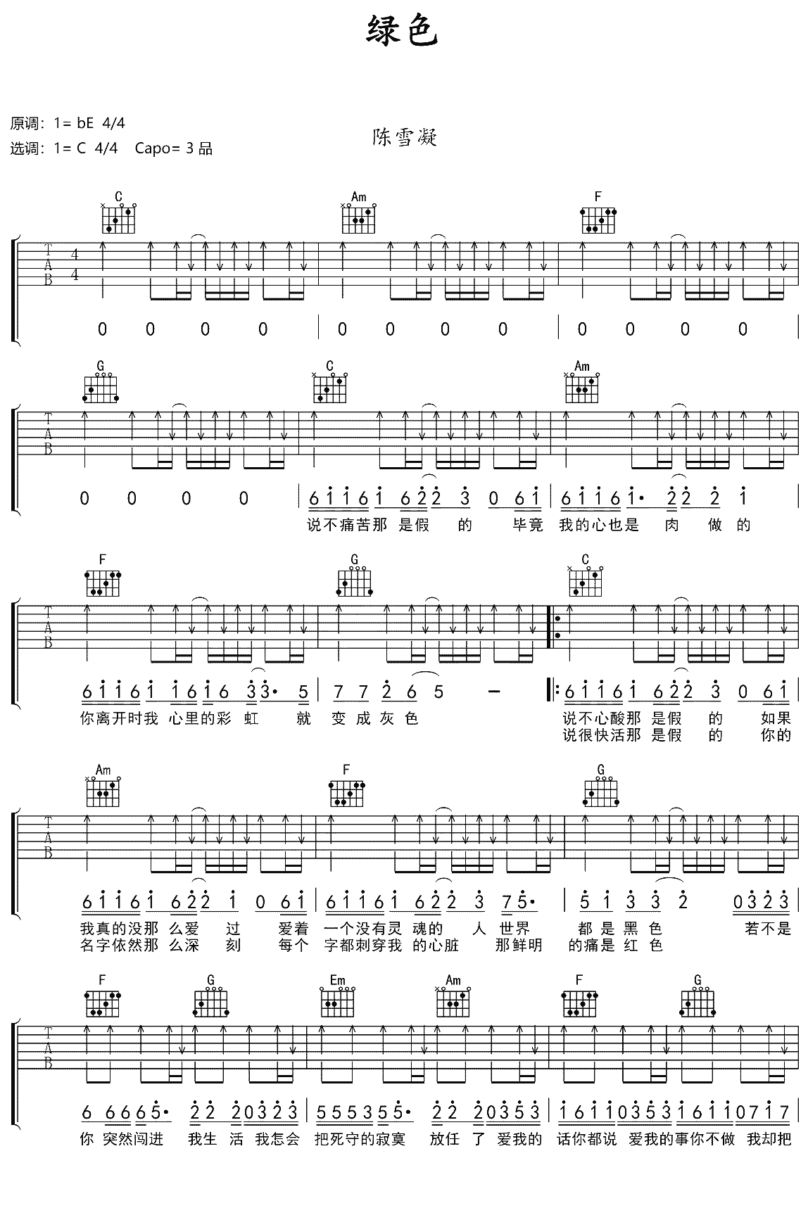 曲谱介绍: 吉他谱介绍:绿色吉他谱,陈雪凝演唱的一首歌曲,4/4拍的节奏,这首歌曲的原调为降E调,这里曲谱采用了C调指法进行编配,演唱时夹变调夹3品可回到原调,也可根据个人实际嗓音情况选择。曲谱由琴谱网更新上传,共2张高清图片弹唱吉他谱例,曲谱来源于网络转载,编配制谱者暂不详。