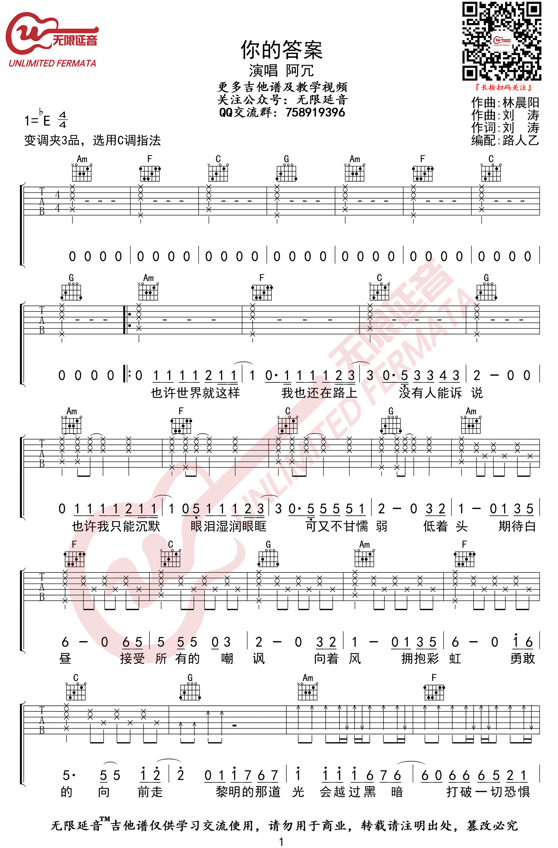 曲谱介绍: 吉他谱介绍:你的答案吉他谱,阿冗演唱的一首歌曲,4/4拍的节奏,这首歌曲的原调为降E调,这里曲谱采用了C调指法进行编配,演唱时夹变调夹3品可回到原调,也可根据个人实际嗓音情况选择。曲谱由琴谱网更新上传,共2张高清图片弹唱吉他谱例,来源于@无限延音编配出品。阿冗热血的演唱和激昂人心的歌词,戳中了无数人的心。这首歌恰好切中了时代的声音,它广泛传唱的背后,是一个热爱生活的音乐人所爆发出来的能量,给予无数人前行的力量。