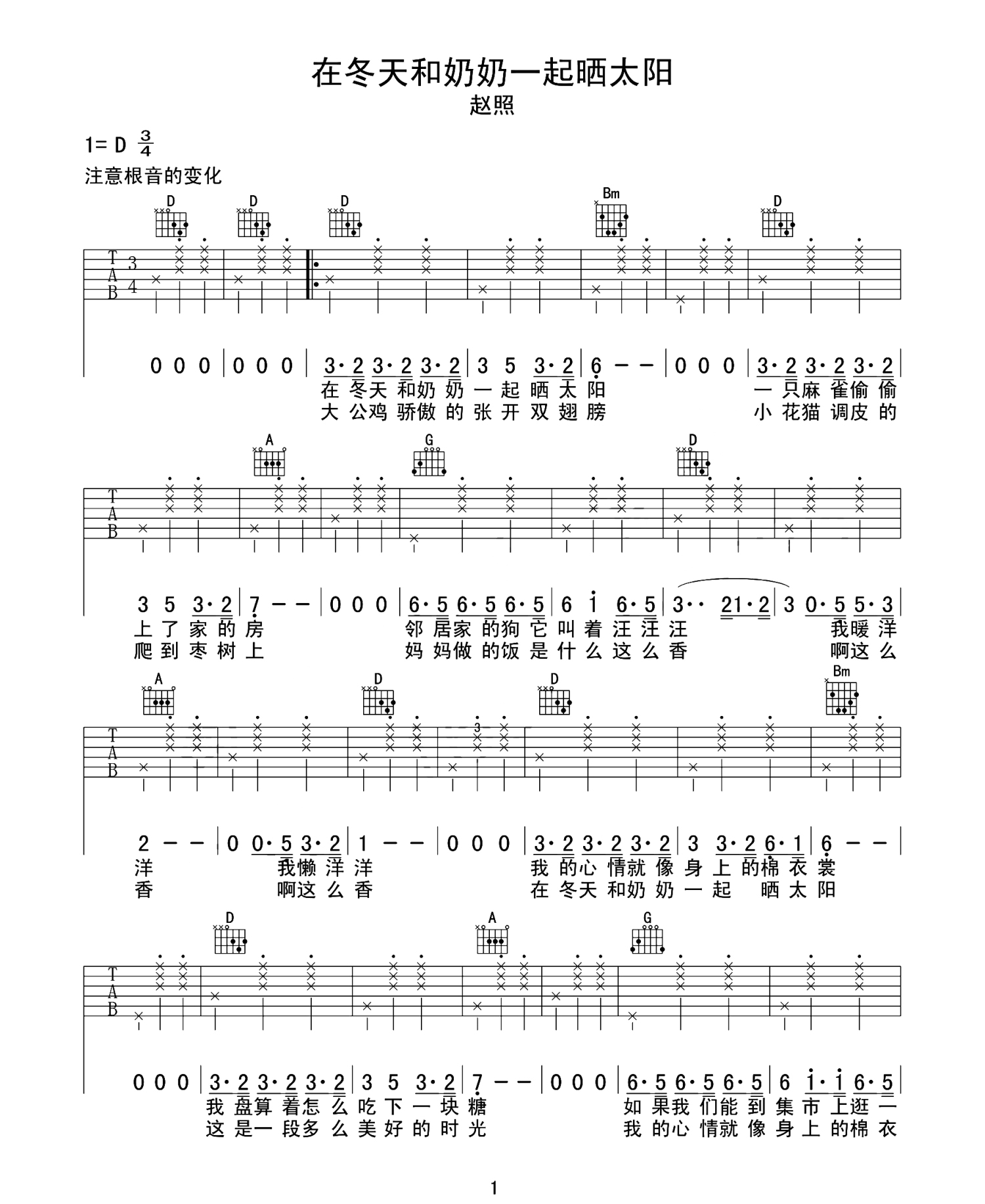 曲谱介绍: 赵照《在冬天和奶奶一起晒太阳》吉他谱_D调吉他弹唱谱