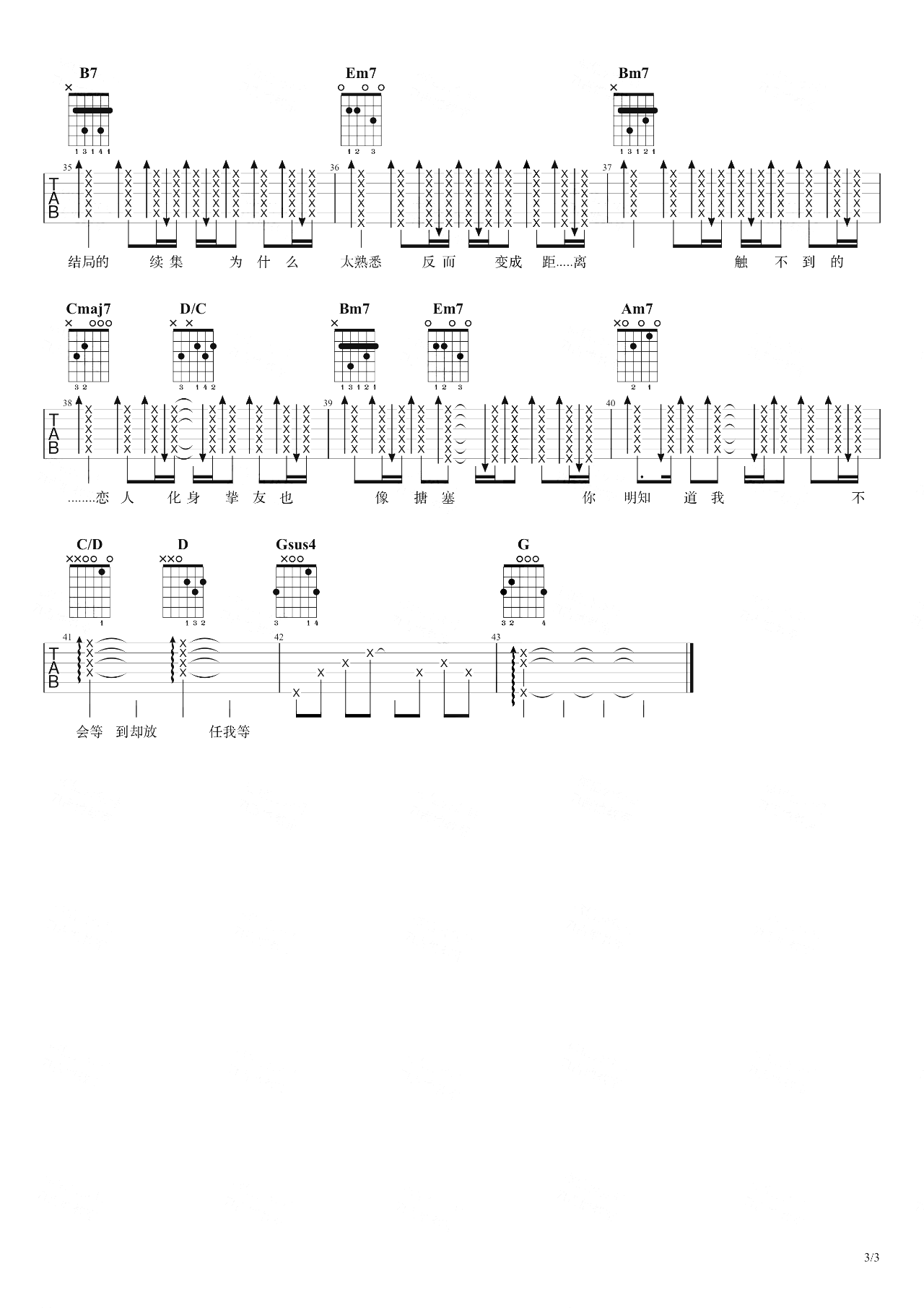 曲谱介绍: 吉他谱介绍:挚友吉他谱,周兴哲演唱的一首歌曲,4/4拍的节奏,这首歌曲的原调为降B调,这里曲谱采用了G调指法进行编配,演唱时夹变调夹3品可回到原调,也可根据个人实际嗓音情况选择。曲谱由琴谱网更新上传,共3张高清图片弹唱吉他谱例,来源于@7T吉他教室编配出品。这首歌的整体和弦框架以卡农走向为主,运用了一些斜杠和弦来连接低音,比如 Gadd9→D/F# →Em7;副歌用到了副属和弦B7→Em7,也是很常见的用法。 挚友吉他弹唱教学