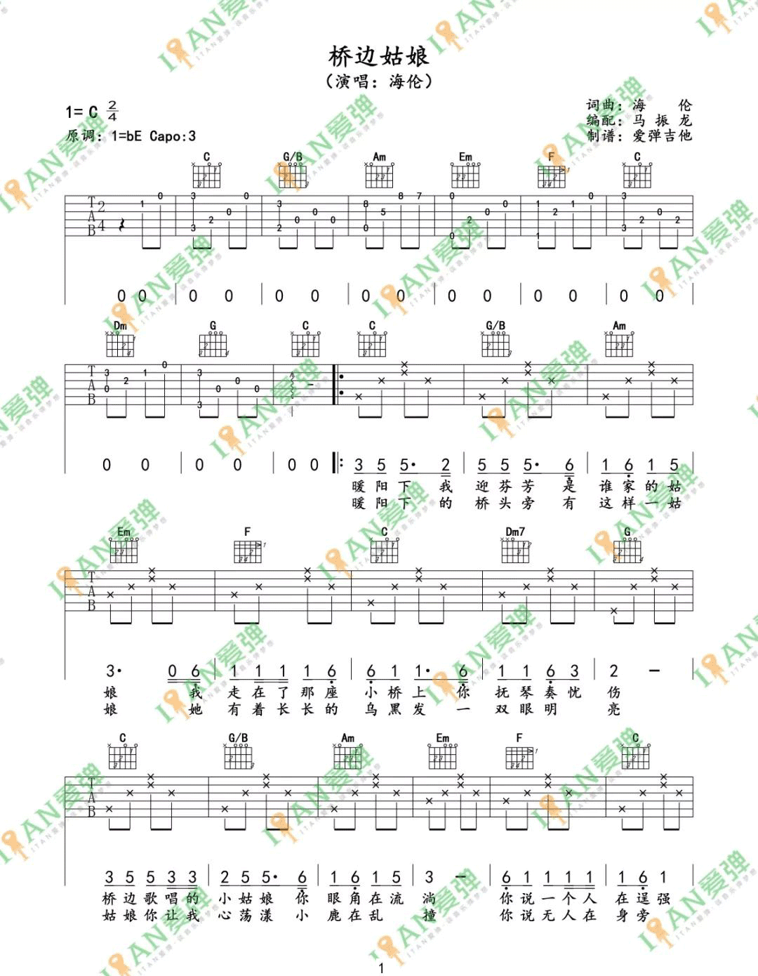 桥边姑娘吉他谱 - 海伦 - C调吉他弹唱谱 - 原版