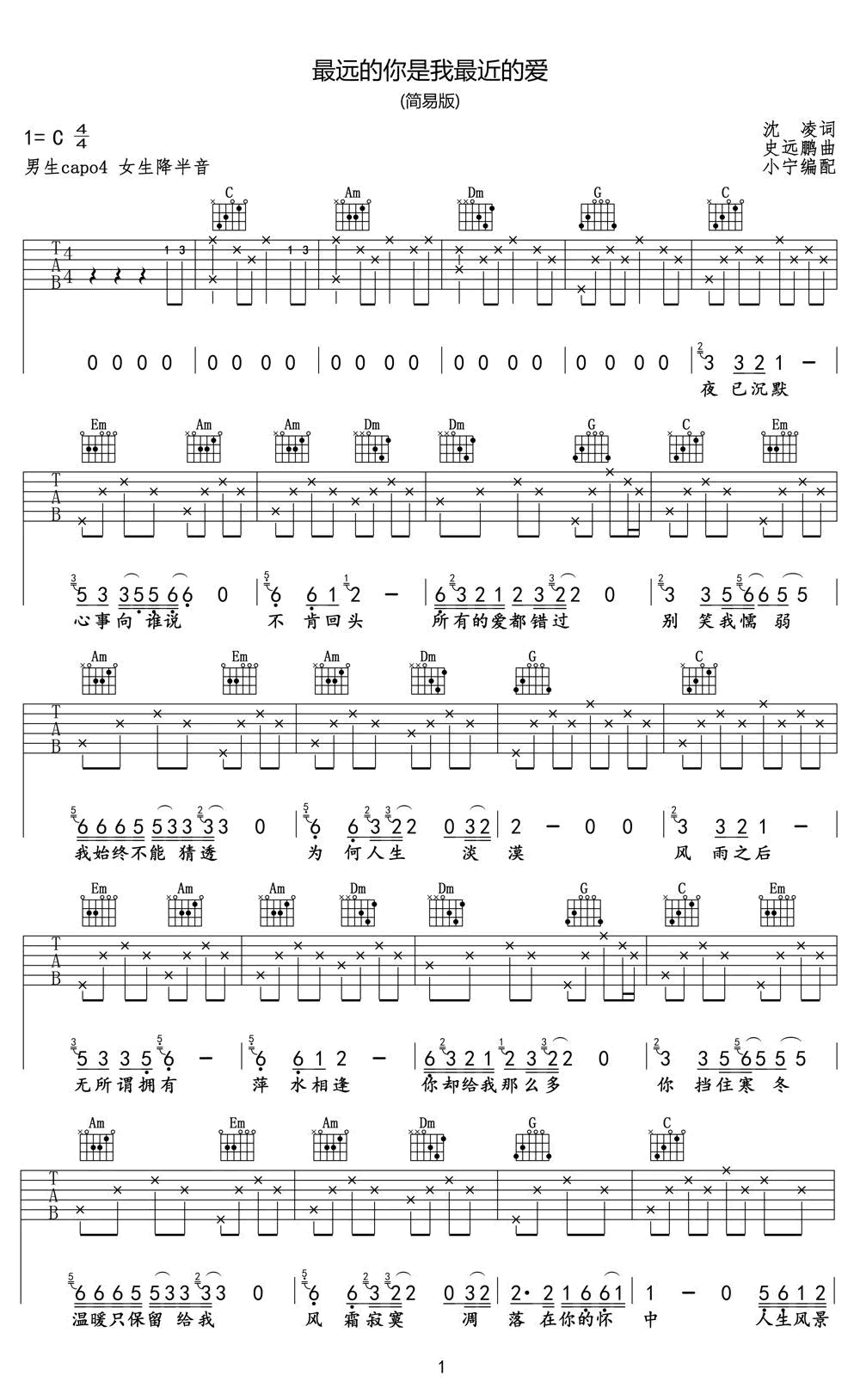 曲谱介绍: 吉他谱介绍:最远的你是我最近的爱吉他谱,车继铃演唱的一首歌曲,4/4拍的节奏,这首歌曲的原调为E调,这里曲谱采用了C调指法进行编配,演唱时夹变调夹4品可回到原调,也可根据个人实际嗓音情况选择。曲谱由琴谱网更新上传,共3张高清图片弹唱吉他谱例,来源于@小宁编配出品。这是一首华语乐坛的经典歌曲,网上有关这首歌的资料很少,老歌需要怀旧,经典永不过时,没听过的琴友赶紧来感受一下。