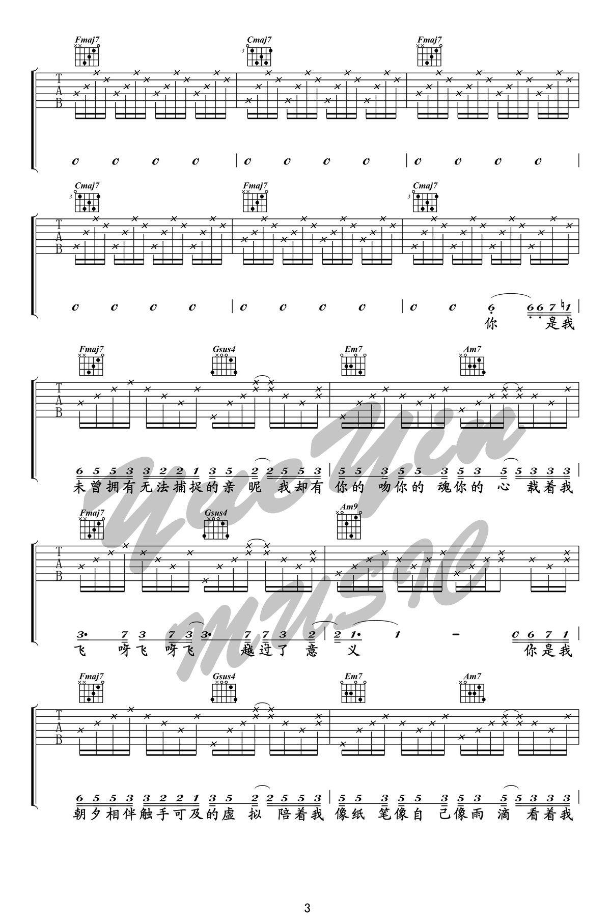 曲谱介绍: 吉他谱介绍:虚拟吉他谱,陈粒演唱的一首歌曲,4/4拍的节奏,这首歌曲的原调为C调,这里曲谱采用了C调指法进行编配,演唱时可不夹变调夹,曲谱由琴谱网更新上传,共4张高清图片弹唱吉他谱例,来源于@悦音之声编配出品。这首歌可谓是感动了许多人了,幻想过无数次与不可能的人相恋,但又珍惜这种无法触及的虚拟,觉得仿佛拥有了就不是这种美好,拥有了那个人就会从神坛撤下来。