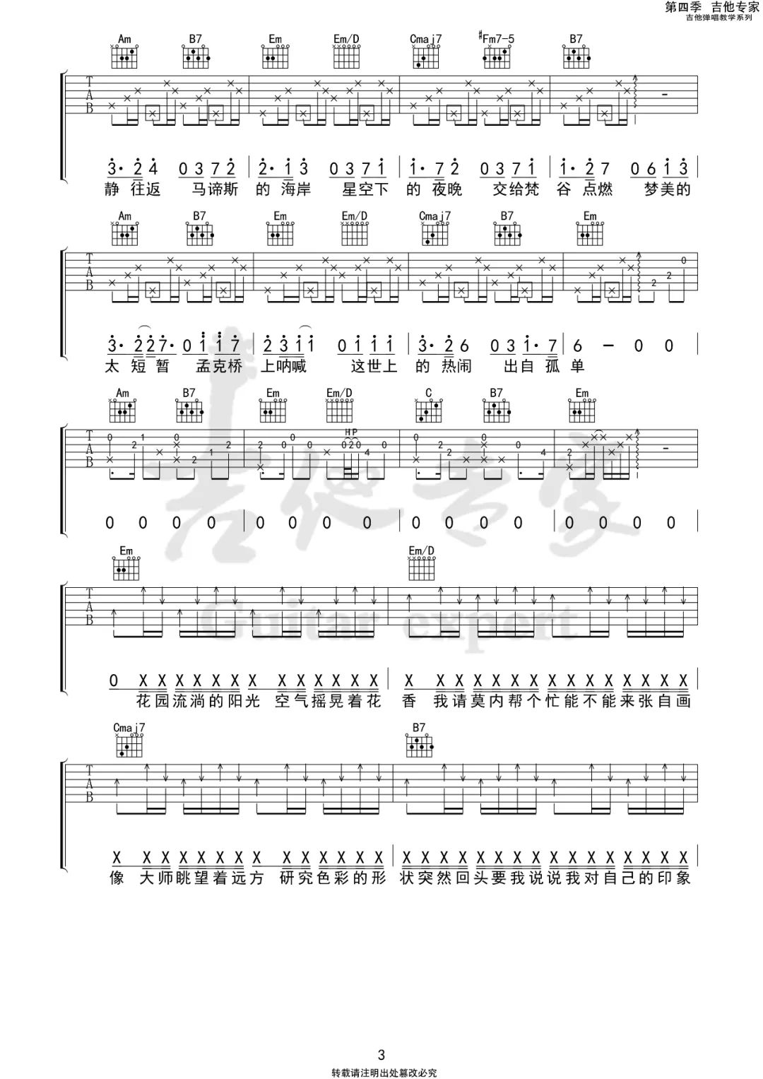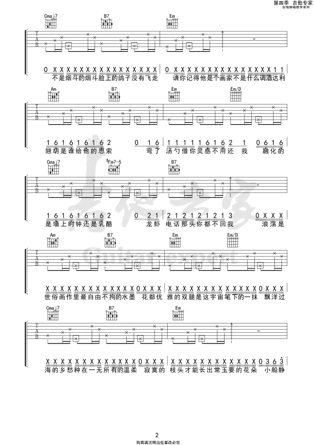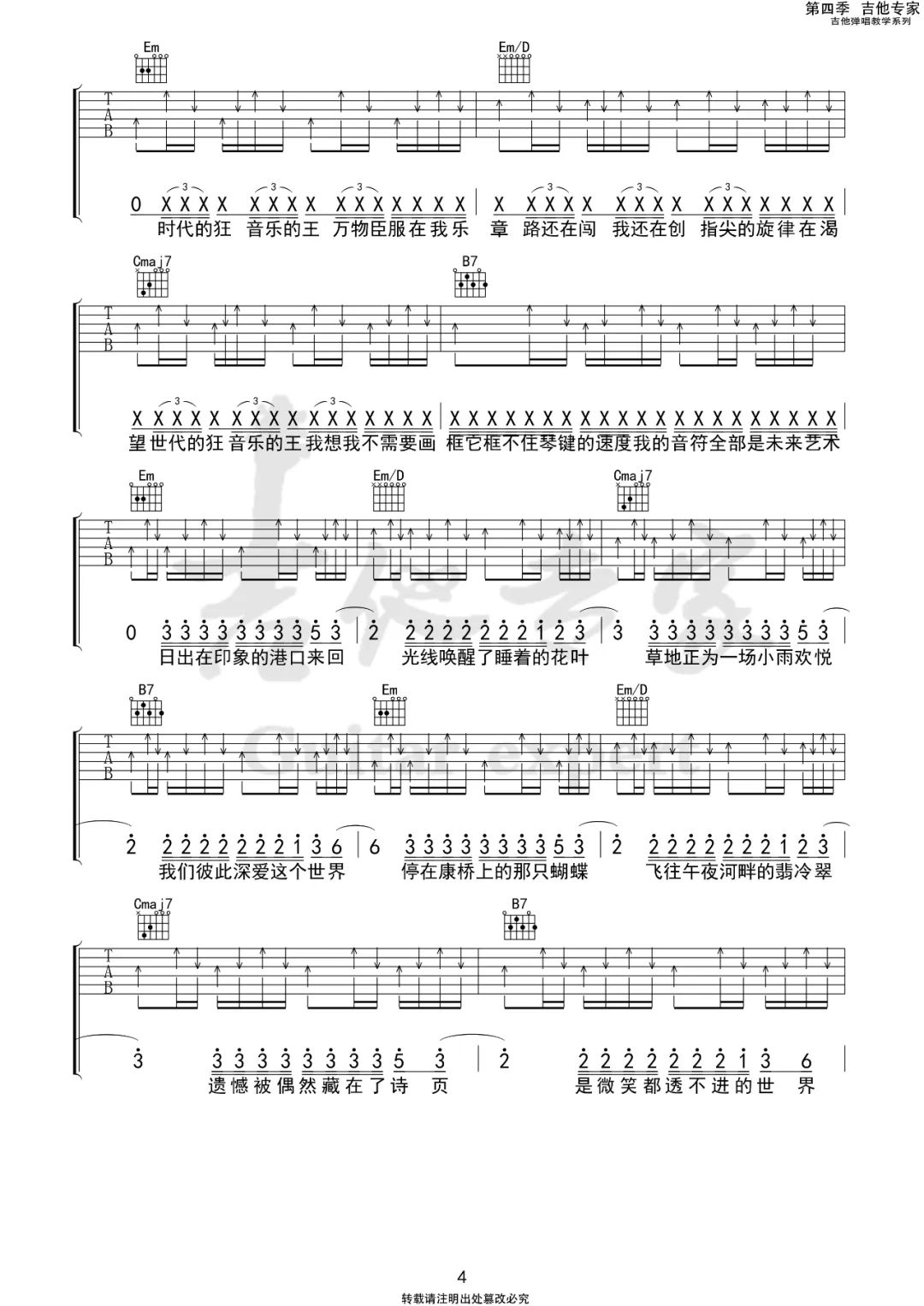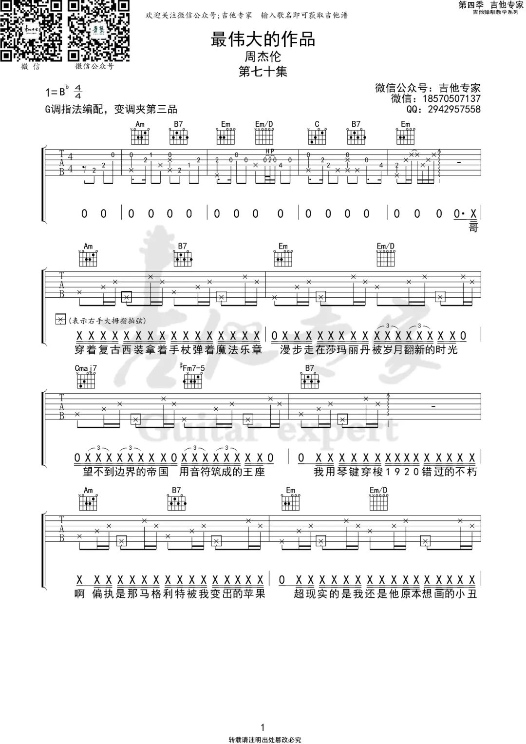 曲谱介绍: 吉他谱介绍:最伟大的作品吉他谱,周杰伦演唱的一首歌曲,4/4拍的节奏,这首歌曲的原调为降B调,这里曲谱采用了G调指法进行编配,演唱时夹变调夹3品可回到原调,也可根据个人实际嗓音情况选择。曲谱由琴谱网更新上传,共5张高清图片弹唱吉他谱例,来源于@吉他专家编配出品。周杰伦今天刚出的一首新歌,在这首歌中,周杰伦用自己的方式致敬了很多伟大的艺术家,和歌名以及专辑名“最伟大的作品”遥相呼应。