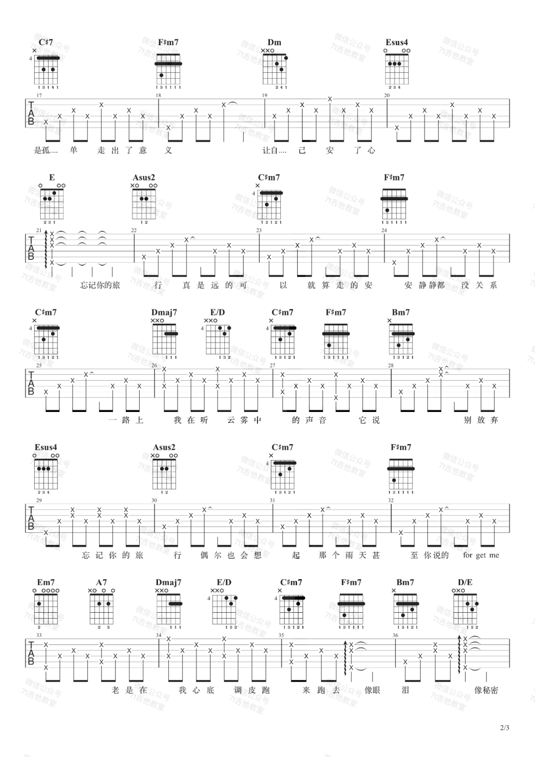 曲谱介绍: 吉他谱介绍:旅行中忘记吉他谱,袁娅维演唱的一首歌曲,4/4拍的节奏,这首歌曲的原调为F调,这里曲谱采用了A调指法进行编配,演唱时可根据个人情况选择变调夹,曲谱由琴谱网更新上传,共3张高清图片弹唱吉他谱例,来源于@7T吉他教室编配出品。歌曲和弦色彩方面,一级用得比较丰富,有add9、sus2、maj7、sus4;四级用了maj7还有四级小和弦;二级、三级、六级用了小七,某些地方的三级还用了属七(作为副属和弦);五级用了sus4或4/5。