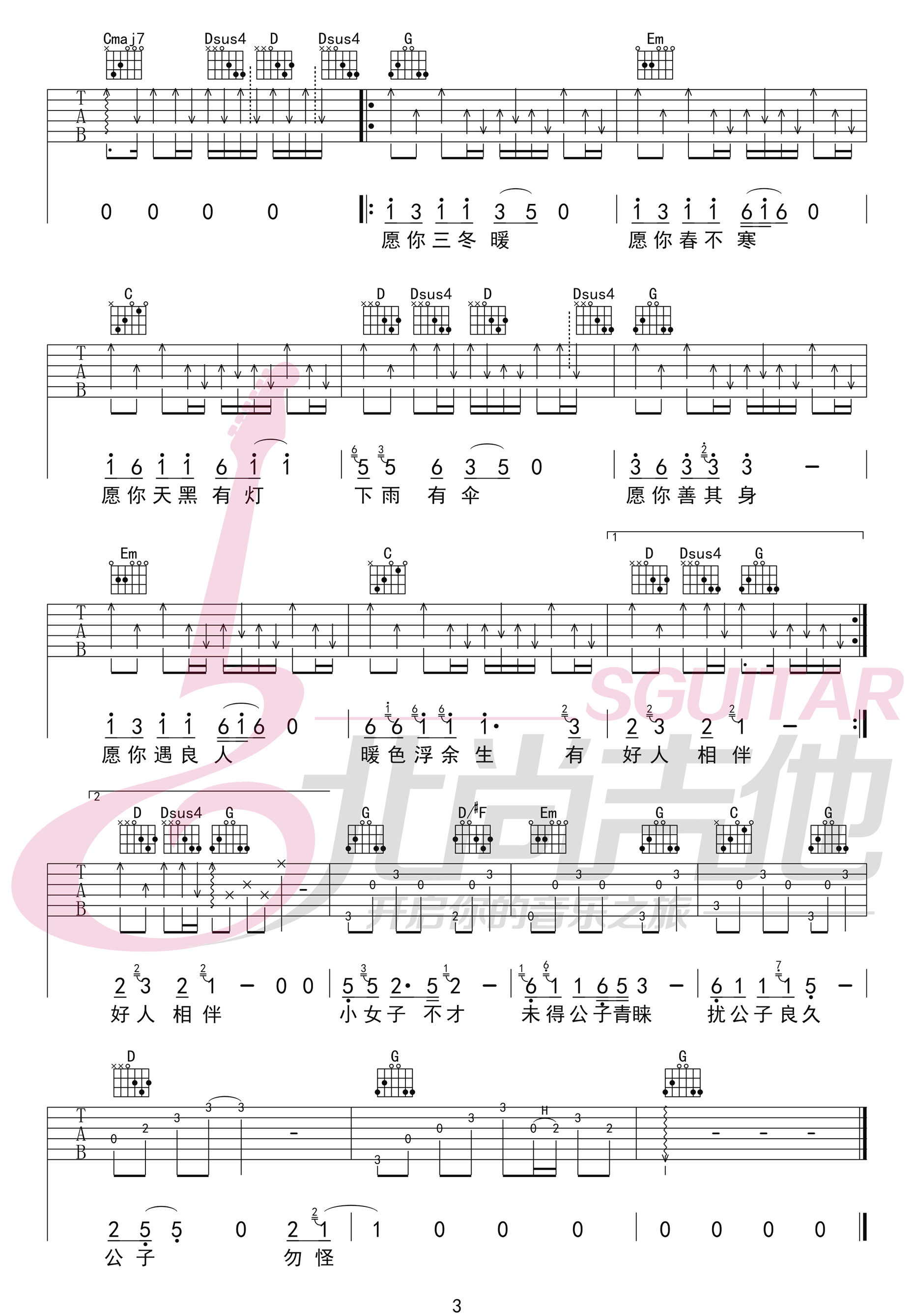曲谱介绍: 吉他谱介绍:公子向北走吉他谱,李春花演唱的一首歌曲,4/4拍的节奏,这首歌曲的原调为G调,这里曲谱采用了G调指法进行编配,演唱时可不夹变调夹,曲谱由琴谱网更新上传,共3张高清图片弹唱吉他谱例,来源于@北尚吉他编配出品。李春花从2015年才开始学习吉他,距离现在时间并不长,这首歌也是她老师给她写的单曲,一首很好听的古风歌曲。