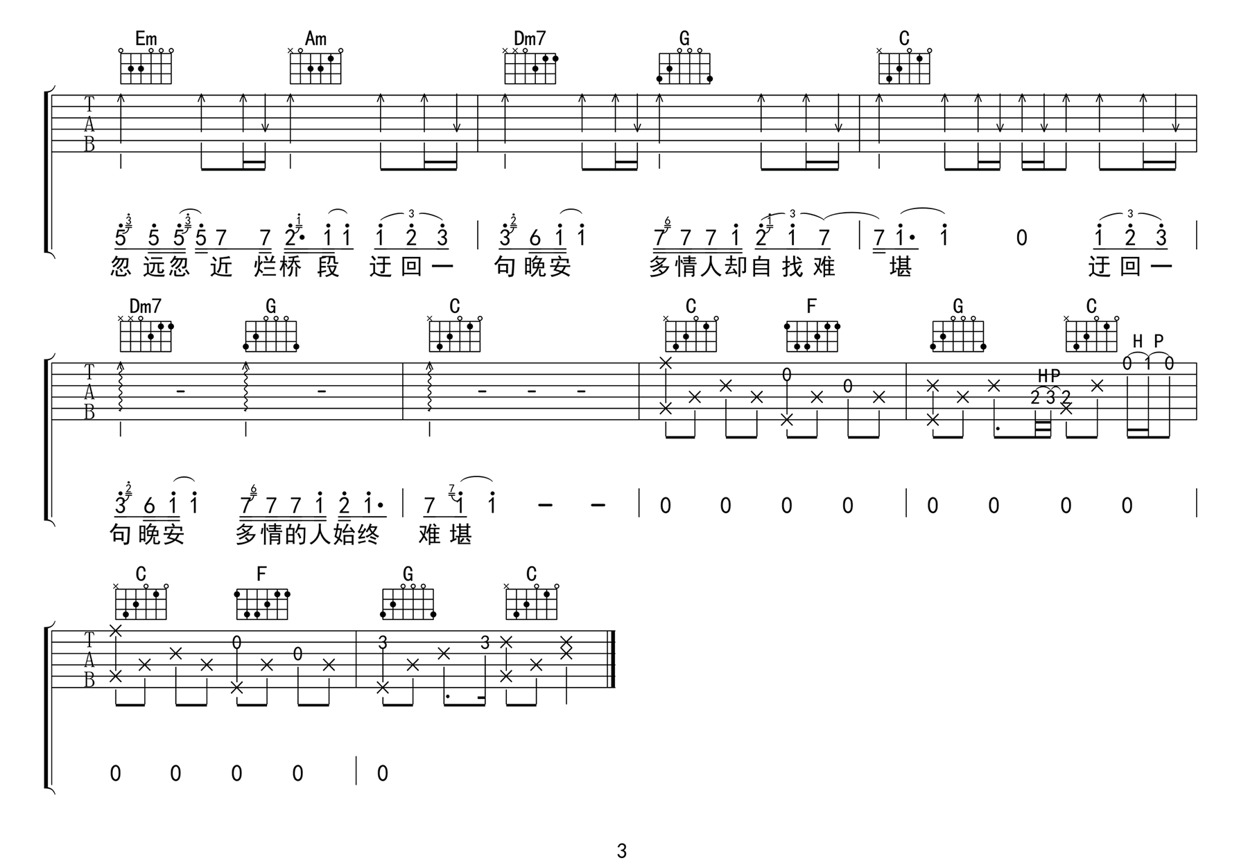 曲谱介绍: 吉他谱介绍:晚安吉他谱,颜人中演唱的一首歌曲,4/4拍的节奏,这首歌曲的原调为C调,这里曲谱采用了C调指法进行编配,演唱时可不夹变调夹,曲谱由琴谱网更新上传,共3张高清图片弹唱吉他谱例,来源于@吴先生TAB编配出品。“迂回一句晚安,曾经多少个牵肠拉扯不舍夜晚”,歌词所表达的纠结情感,被颜人中演绎得丝丝入扣。