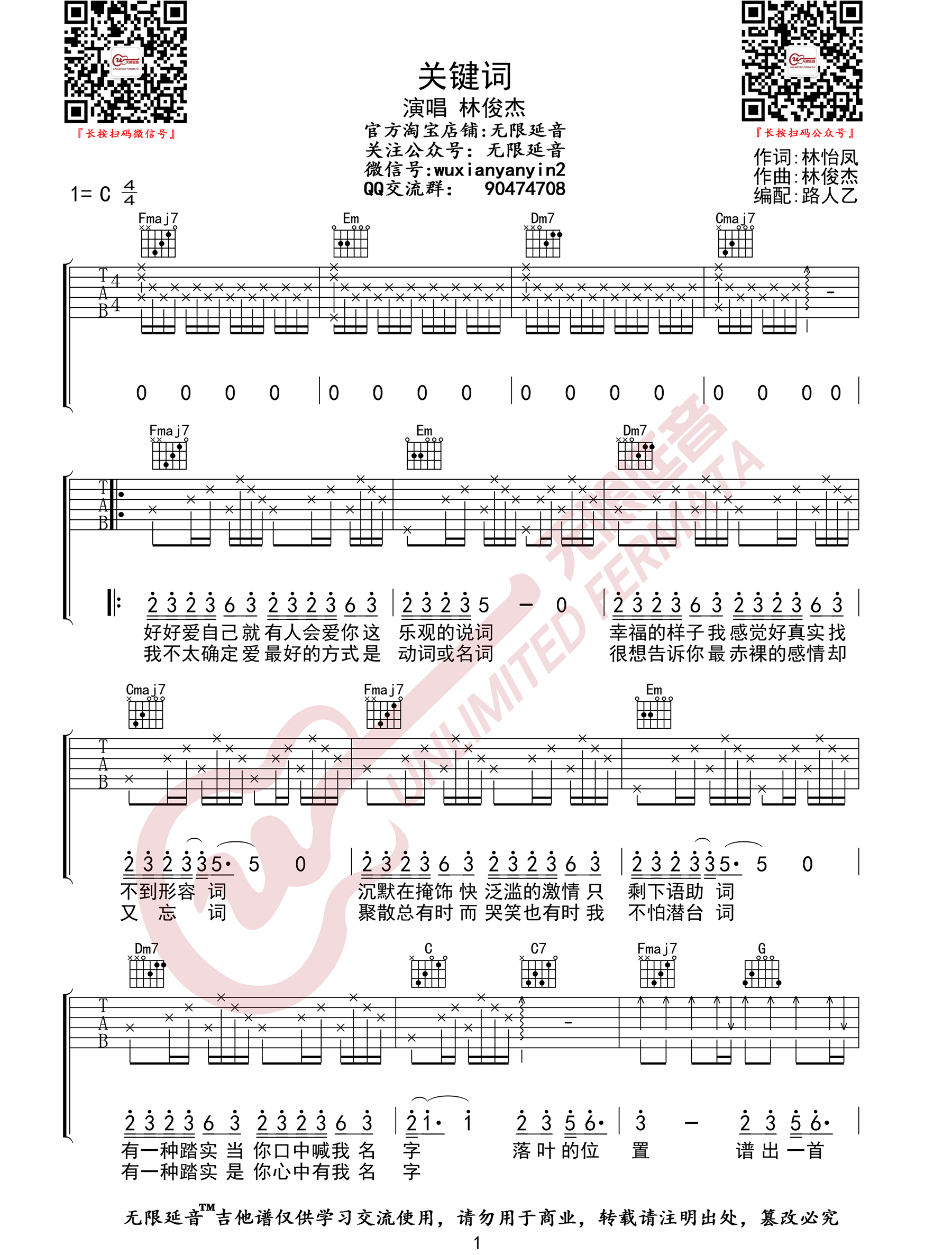 曲谱介绍: 吉他谱介绍:关键词吉他谱,林俊杰演唱的一首歌曲,4/4拍的节奏,这首歌曲的原调为C调,这里曲谱采用了C调指法进行编配,演唱时可不夹变调夹,曲谱由琴谱网更新上传,共3张高清图片弹唱吉他谱例,来源于@无限延音编配出品。