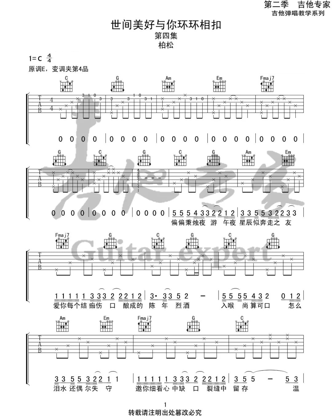 曲谱介绍: 吉他谱介绍:世间美好与你环环相扣吉他谱,柏松演唱的一首歌曲,4/4拍的节奏,这首歌曲的原调为E调,这里曲谱采用了C调指法进行编配,演唱时夹变调夹4品可回到原调,也可根据个人实际嗓音情况选择。曲谱由琴谱网更新上传,共3张高清图片弹唱吉他谱例,来源于@吉他专家编配出品。这首歌是一首具有治愈力量的歌,无论词曲还是演唱,都唱出了人们心中的一股暖流,从而击中了千万人心里的柔情,并给予温暖的力量。