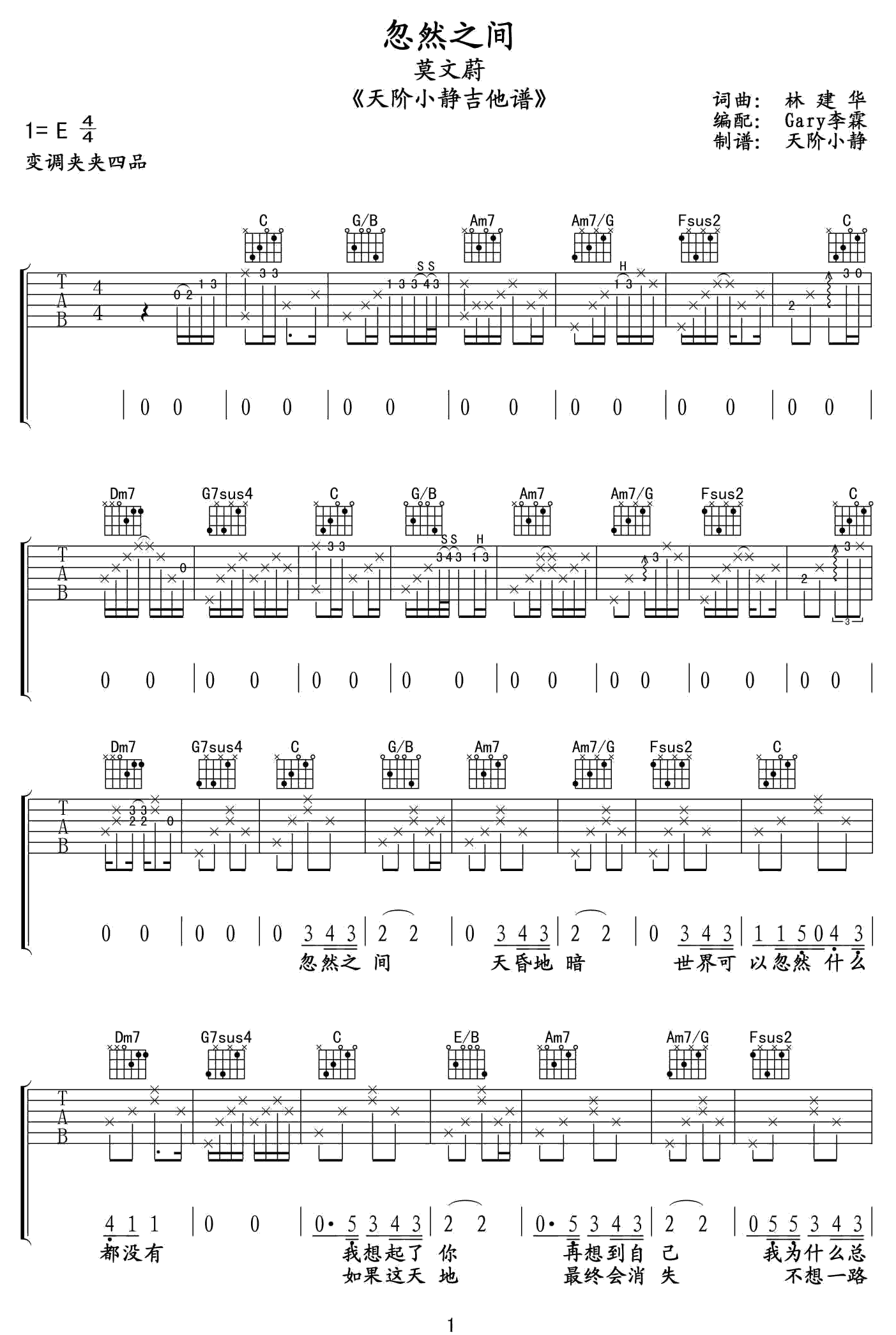 曲谱介绍: 吉他谱介绍:忽然之间吉他谱,莫文蔚演唱的一首歌曲,4/4拍的节奏,这首歌曲的原调为E调,这里曲谱采用了C调指法进行编配,演唱时夹变调夹4品可回到原调,也可根据个人实际嗓音情况选择。曲谱由琴谱网更新上传,共3张高清图片弹唱吉他谱例,来源于@天阶小静编配出品。这首歌是一首为地震而作之歌,感情细腻、耐听的作品,其中三段吉他的独奏,勾起大家浓浓的情感。