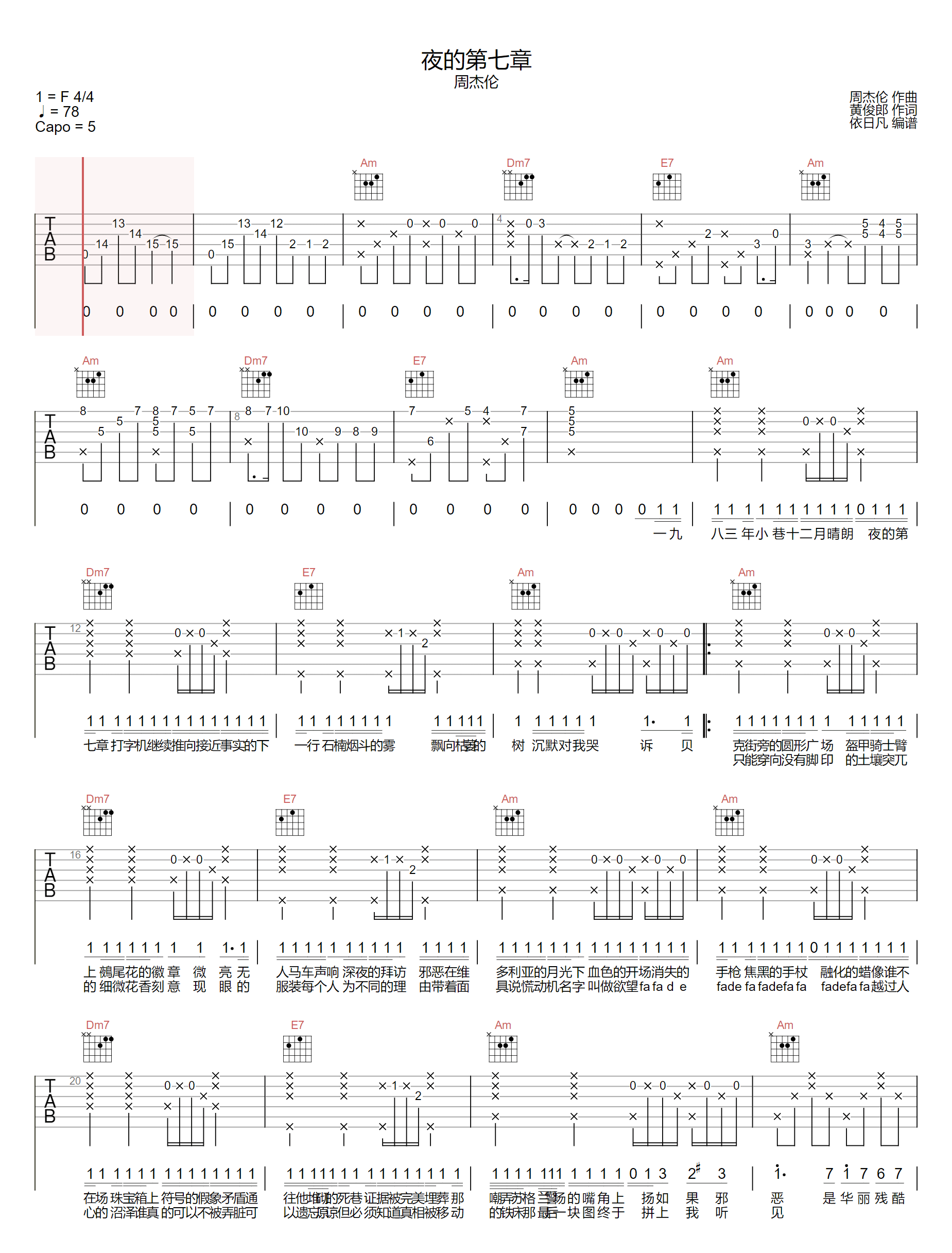 曲谱介绍: 吉他谱介绍:夜的第七章吉他谱,周杰伦演唱的一首歌曲,4/4拍的节奏,这首歌曲的原调为F调,这里曲谱采用了C调指法进行编配,演唱时夹变调夹5品可回到原调,也可根据个人实际嗓音情况选择。曲谱由琴谱网更新上传,共2张高清图片弹唱吉他谱例,来源于@依日凡编配出品。周杰伦刻意压低的硬嗓唱法搭配幽幽女高音,暗示着侦探的冷静与凶手的疯狂,乐曲到最后听见周杰伦以假音唱完,呈现流行音乐中难得一见的电影配乐格局。