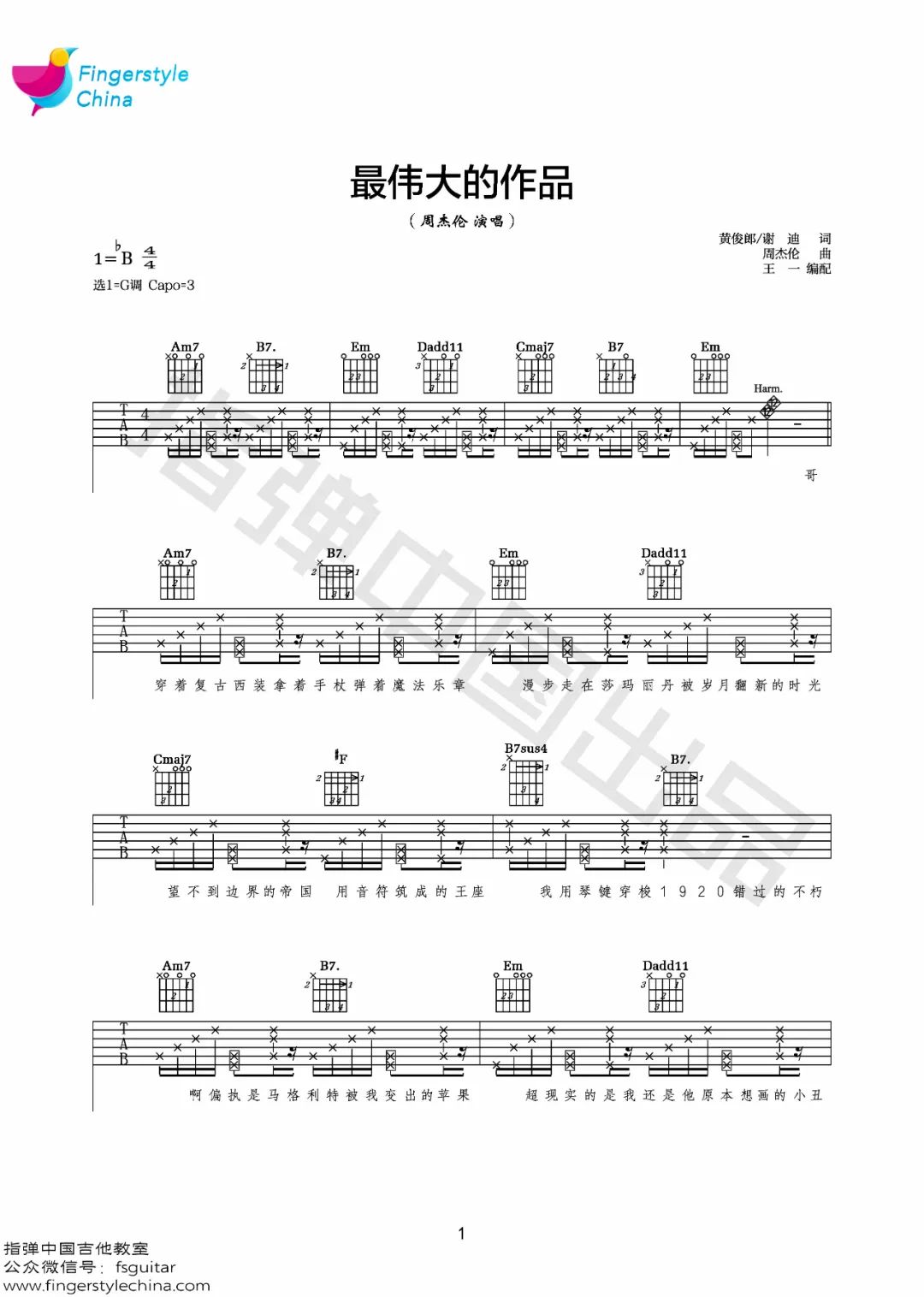 曲谱介绍: 吉他谱介绍:最伟大的作品吉他谱,周杰伦演唱的一首歌曲,4/4拍的节奏,这首歌曲的原调为降B调,这里曲谱采用了G调指法进行编配,演唱时夹变调夹3品可回到原调,也可根据个人实际嗓音情况选择。曲谱由琴谱网更新上传,共5张高清图片弹唱吉他谱例,来源于@王一编配出品。在这首歌的前导纪录片中,周杰伦通过vlog形式透露要“写一首老歌”,为此他带着一群人在巴黎旧货市场寻找老旧的麦克风、乐器等匹配歌曲风格,随后前往歌剧院录制配唱。