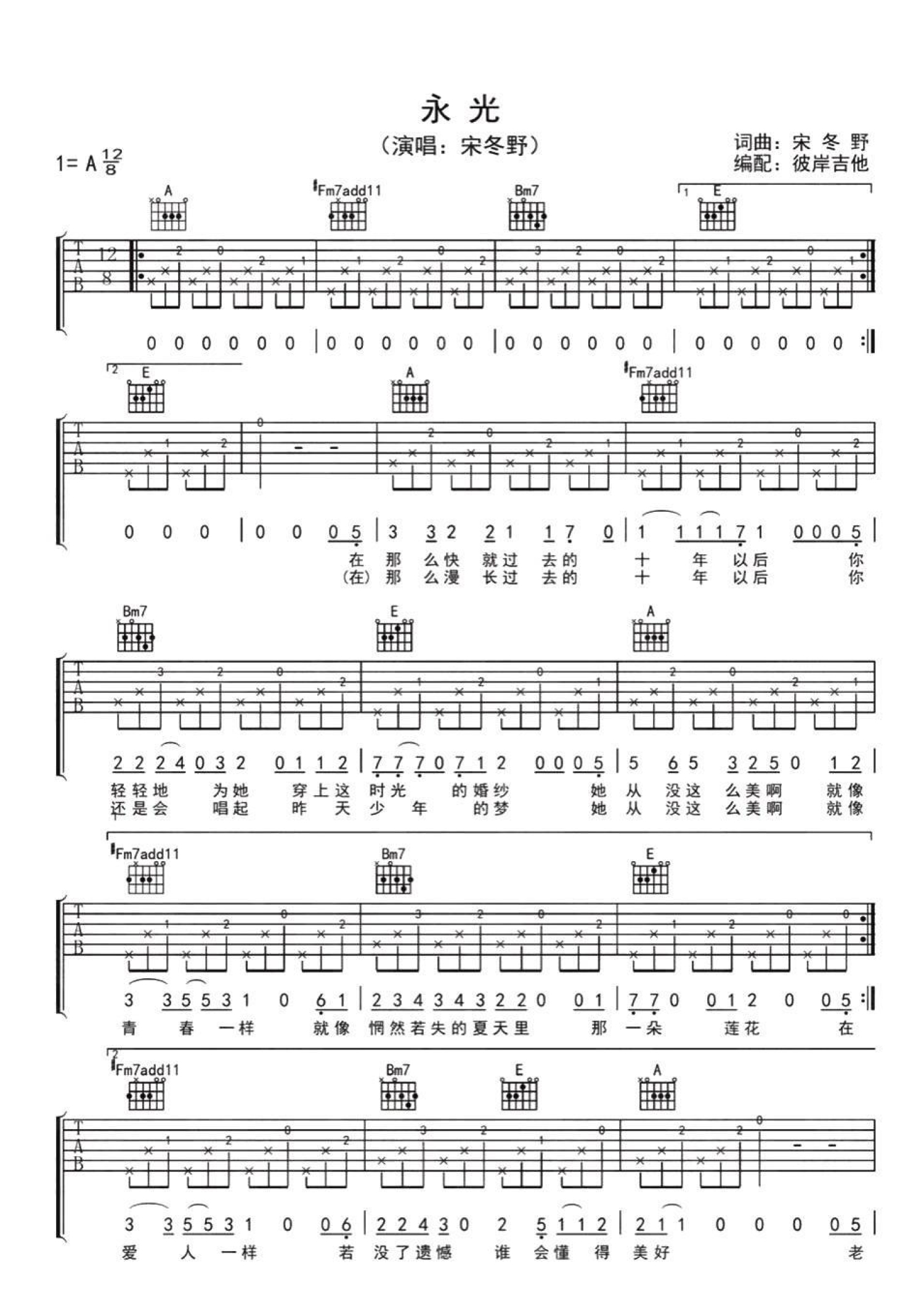 曲谱介绍: 宋冬野《永光》吉他谱_A调吉他弹唱谱