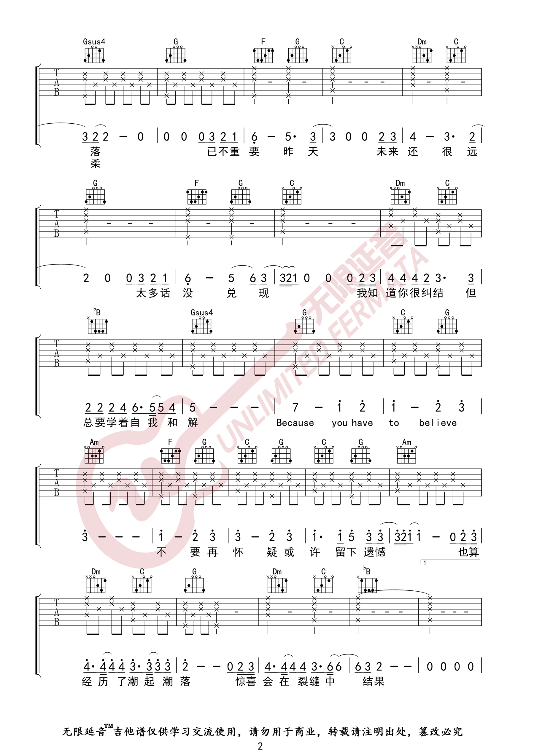 曲谱介绍: 吉他谱介绍:你要相信这不是最后一天吉他谱,华晨宇演唱的一首歌曲,4/4拍的节奏,这首歌曲的原调为#F调,这里曲谱采用了C调指法进行编配,演唱时夹变调夹6品可回到原调,也可根据个人实际嗓音情况选择。曲谱由琴谱网更新上传,共3张高清图片弹唱吉他谱例,来源于@无限延音编配出品。