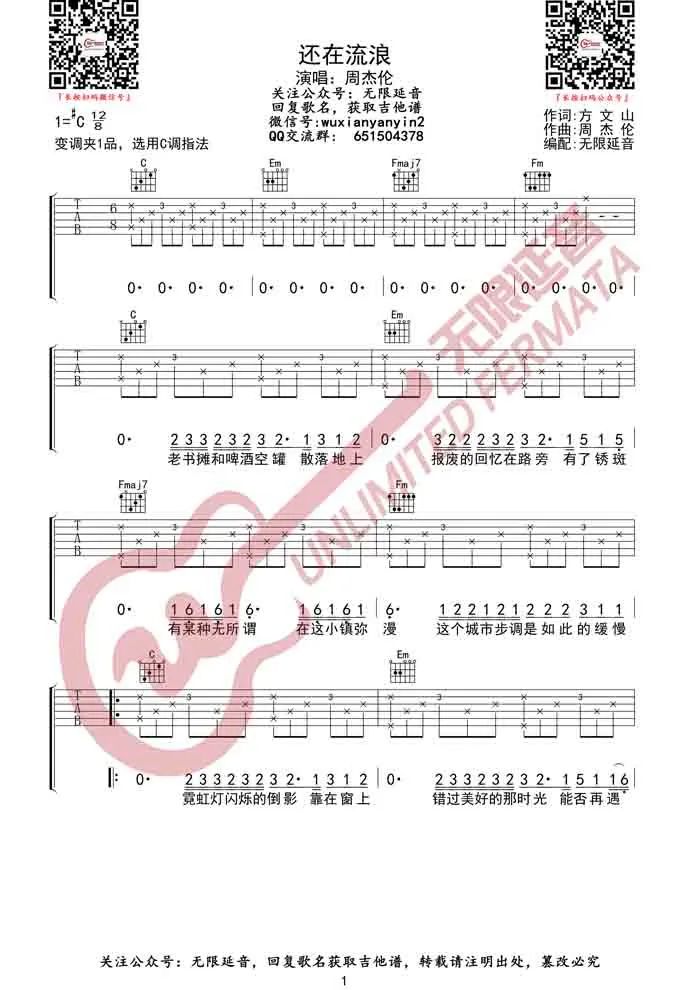 曲谱介绍: 吉他谱介绍:还在流浪吉他谱,周杰伦演唱的一首歌曲,6/8拍的节奏,这首歌曲的原调为#C调,这里曲谱采用了C调指法进行编配,演唱时夹变调夹1品可回到原调,也可根据个人实际嗓音情况选择。曲谱由琴谱网更新上传,共3张高清图片弹唱吉他谱例,来源于@无限延音编配出品。这首歌的词很怀旧,唱腔很感性,像是娓娓道来那些陪伴我们走过的美好的时光和故事,旅途中欣赏到的美景都值得回味,也许还有人在流浪但那年的约定都还放在心上...