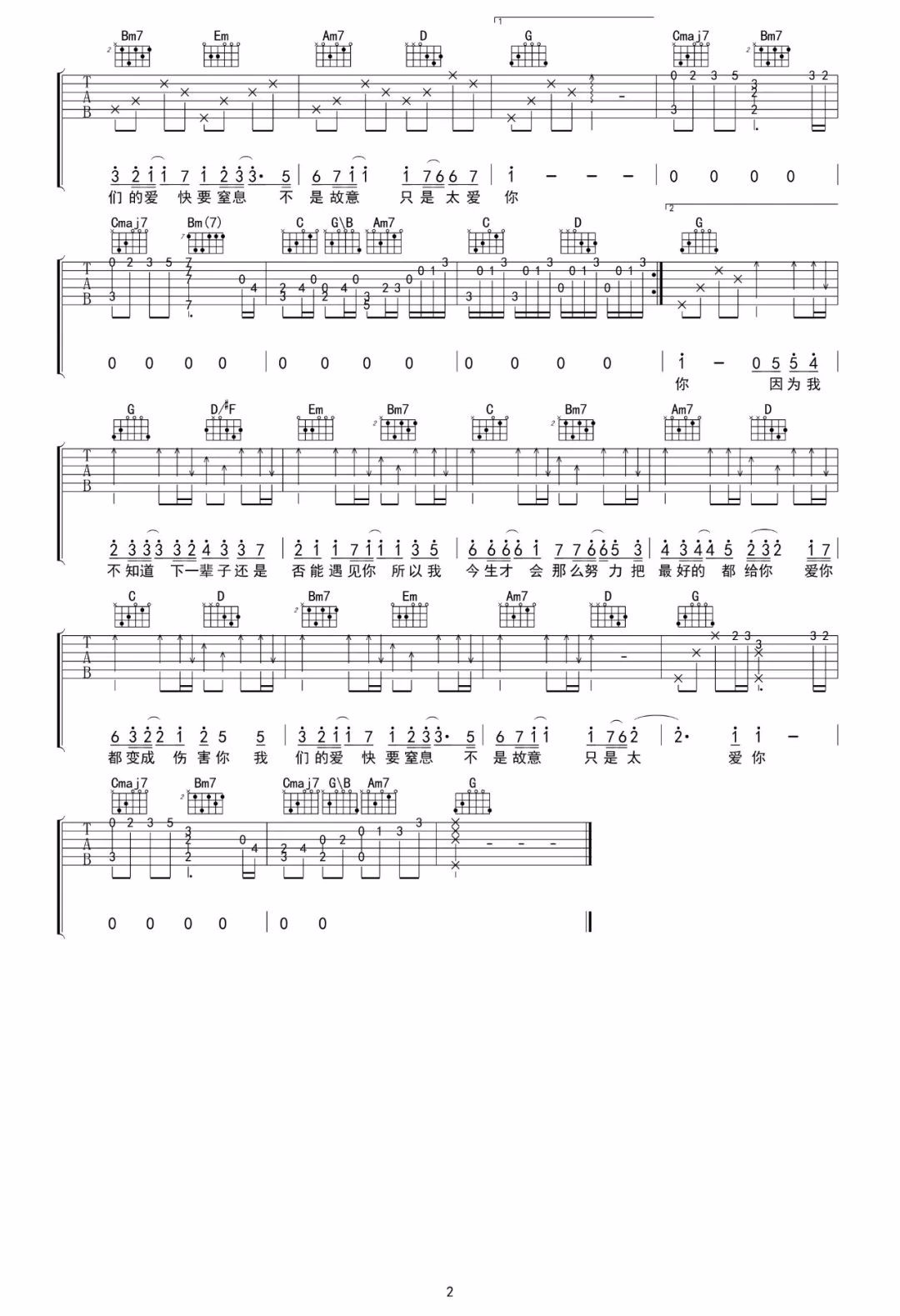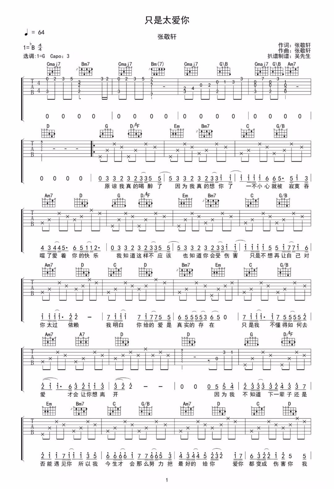 曲谱介绍: 吉他谱介绍:只是太爱你吉他谱,张敬轩演唱的一首歌曲,4/4拍的节奏,这首歌曲的原调为降B调,这里曲谱采用了G调指法进行编配,演唱时夹变调夹3品可回到原调,也可根据个人实际嗓音情况选择。曲谱由琴谱网更新上传,共2张高清图片弹唱吉他谱例,来源于@吴先生TAB编配出品。