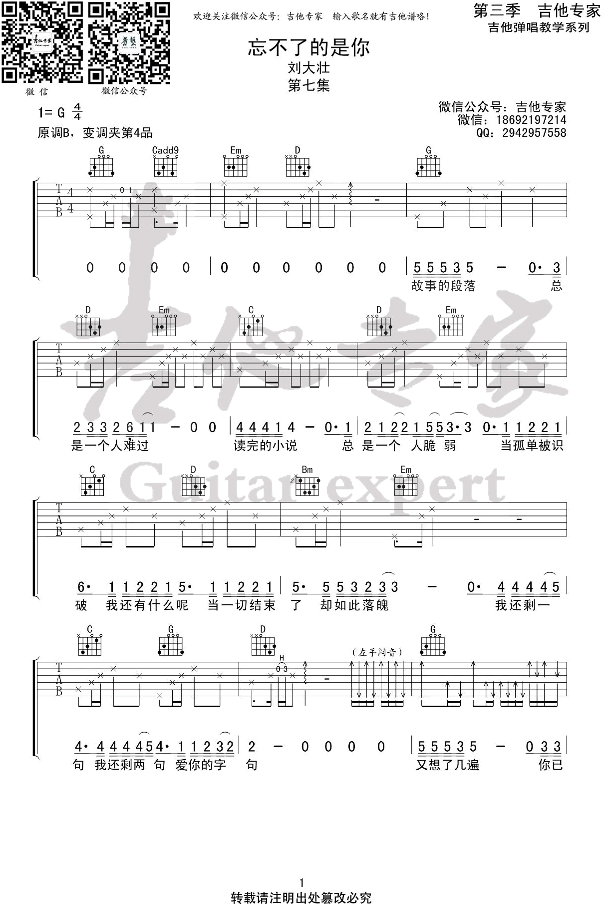 曲谱介绍: 吉他谱介绍:忘不了的是你吉他谱,刘大壮演唱的一首歌曲,4/4拍的节奏,这首歌曲的原调为B调,这里曲谱采用了G调指法进行编配,演唱时夹变调夹4品可回到原调,也可根据个人实际嗓音情况选择。曲谱由琴谱网更新上传,共4张高清图片弹唱吉他谱例,来源于@吉他专家编配出品。