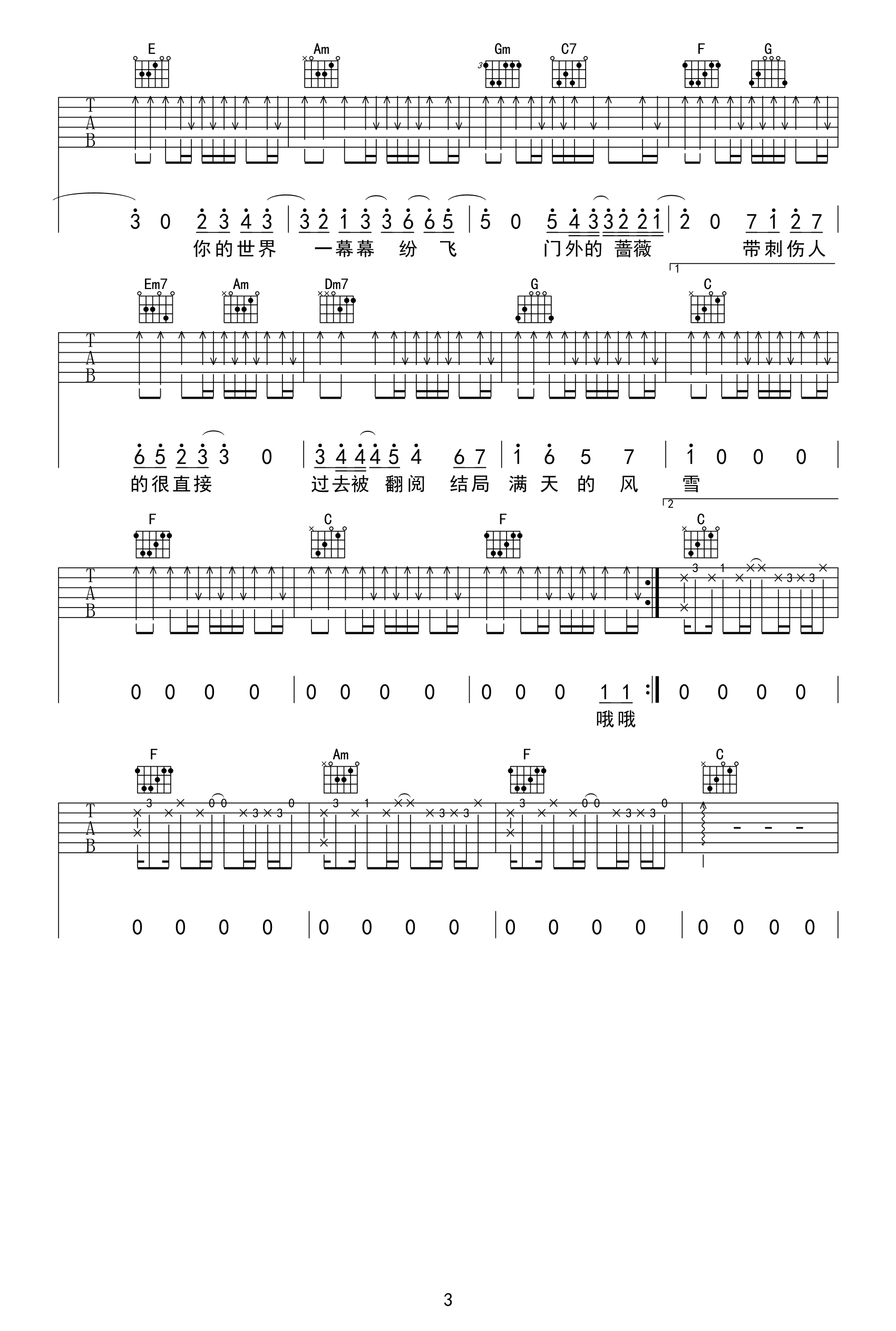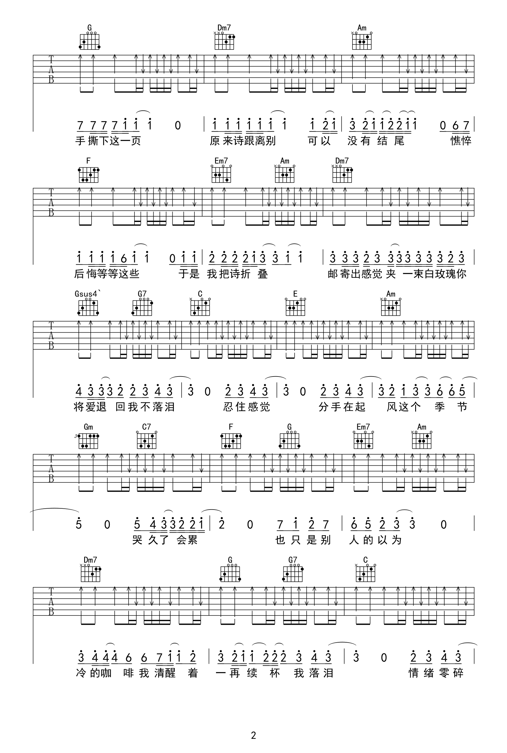 曲谱介绍: 吉他谱介绍:我落泪情绪零碎吉他谱,周杰伦演唱的一首歌曲,4/4拍的节奏,这首歌曲的原调为B调,这里曲谱采用了C调指法进行编配,演唱时降半音调弦可回到原调,也可根据个人实际嗓音情况选择不降音或夹几品。曲谱由琴谱网更新上传,共3张高清图片弹唱吉他谱例,来源于@九月一编配出品。一首典型的周氏慢板情歌,委婉道来,听着让人有种想哭的感觉。歌词是这首歌的最大特点。细心翻看歌词,会发现原来这首歌讲述的是《七里香》的续集,情绪也是从恋爱的美好甜蜜到失恋的难过压抑。