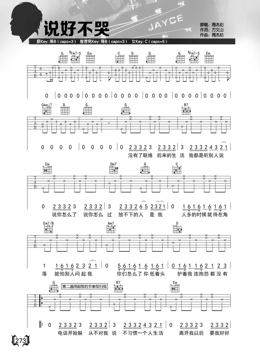 曲谱介绍: 吉他谱介绍:说好不哭吉他谱,周杰伦演唱的一首歌曲,4/4拍的节奏,这首歌曲的原调为降B调,这里曲谱采用了G调指法进行编配,演唱时夹变调夹3品可回到原调,也可根据个人实际嗓音情况选择。曲谱由琴谱网更新上传,共2张高清图片弹唱吉他谱例,来源于@蓝莓吉他编配出品。是一首关于成全与约定的情歌,以钢琴缓缓诉说这段凄美绝伦的爱情故事,整首歌以钢琴为主故事线、弦乐编织出抒情场景,营造出一种爱定格在分手时的那句“说好不哭”。