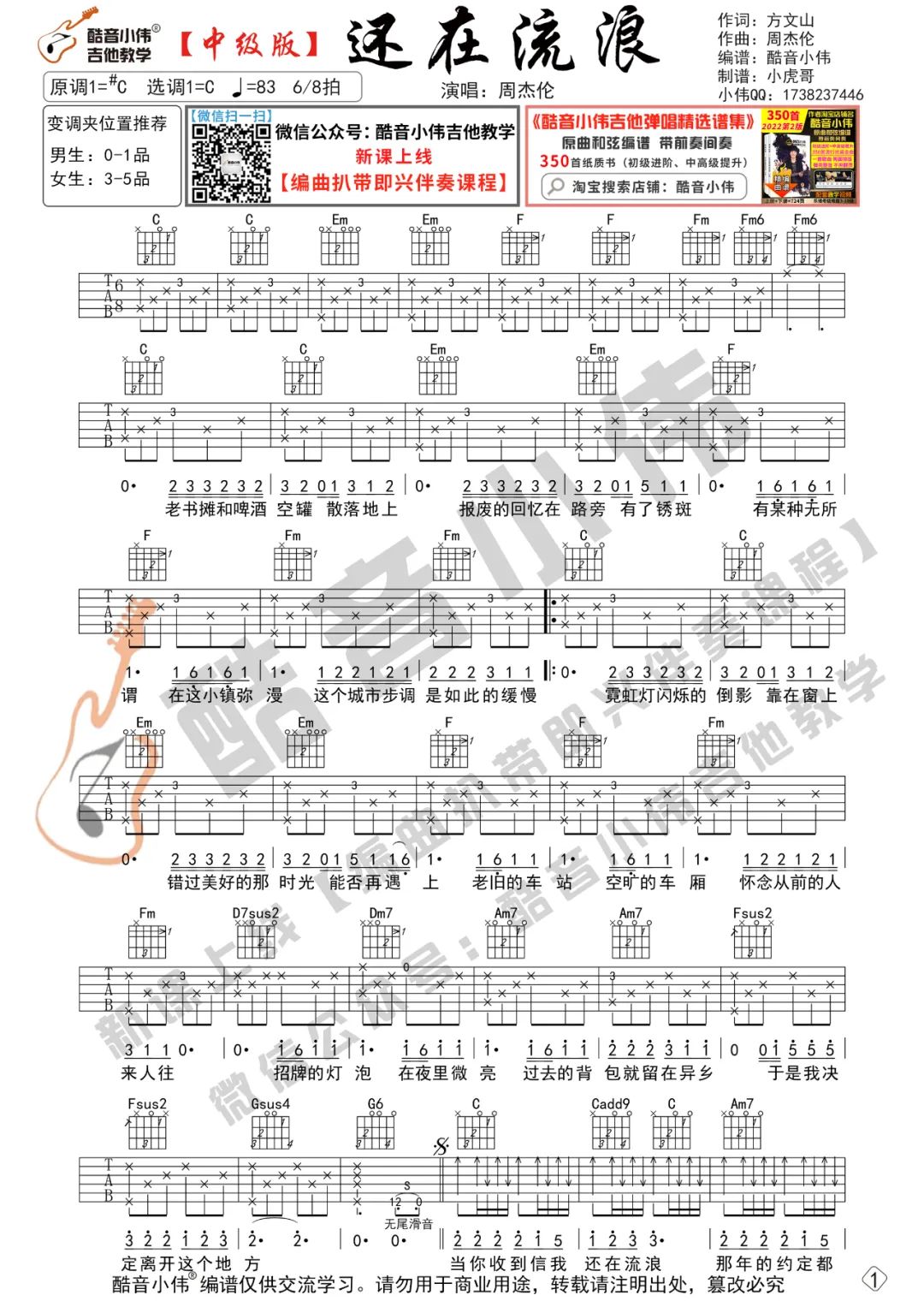 曲谱介绍: 吉他谱介绍:还在流浪吉他谱,周杰伦演唱的一首歌曲,6/8拍的节奏,这首歌曲的原调为#C调,这里曲谱采用了C调指法进行编配,演唱时夹变调夹1品可回到原调,也可根据个人实际嗓音情况选择。曲谱由琴谱网更新上传,共2张高清图片弹唱吉他谱例,来源于@酷音小伟编配出品。这首歌以一颗流浪者的心为主线,带你来到一个曾经浪漫繁花现如今锈迹斑斑的熟悉小城,曲风充满着复古的气息和对美好过去的留恋,“当你收到信,我还在流浪”。