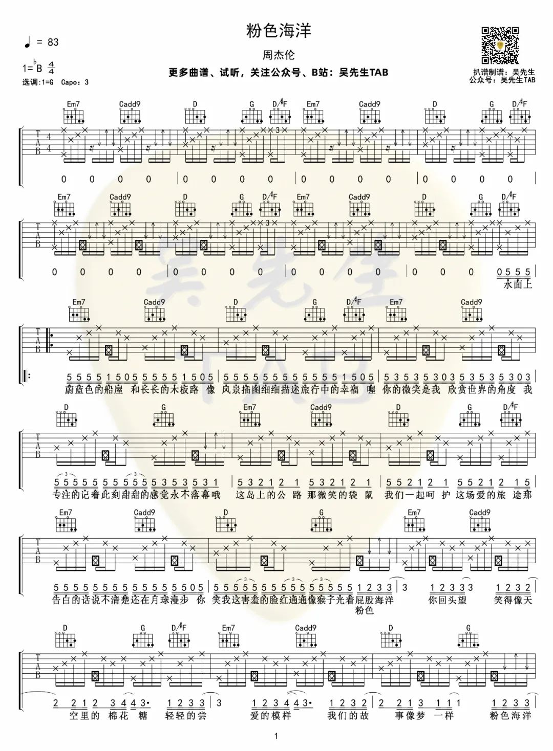 曲谱介绍: 吉他谱介绍:粉色海洋吉他谱,周杰伦演唱的一首歌曲,4/4拍的节奏,这首歌曲的原调为降B调,这里曲谱采用了G调指法进行编配,演唱时夹变调夹3品可回到原调,也可根据个人实际嗓音情况选择。曲谱由琴谱网更新上传,共2张高清图片弹唱吉他谱例,来源于@吴先生TAB编配出品。