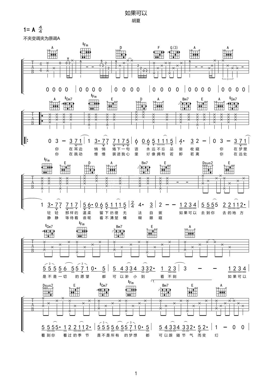 如果可以吉他谱 - 胡夏 - A调吉他弹唱谱 - 原版
