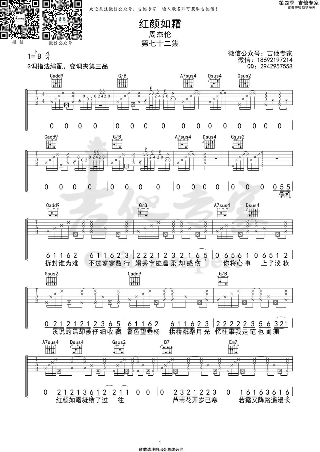曲谱介绍: 吉他谱介绍:红颜如霜吉他谱,周杰伦演唱的一首歌曲,4/4拍的节奏,这首歌曲的原调为降B调,这里曲谱采用了G调指法进行编配,演唱时夹变调夹3品可回到原调,也可根据个人实际嗓音情况选择。曲谱由琴谱网更新上传,共3张高清图片弹唱吉他谱例,来源于@吉他专家编配出品。这首歌在保留以往风格的基础上,又有了一些创新,在歌曲里加入了戏剧元素,让人耳目一新。整首歌曲的曲调非常抓耳,让人不知不觉地就单曲循环起来。