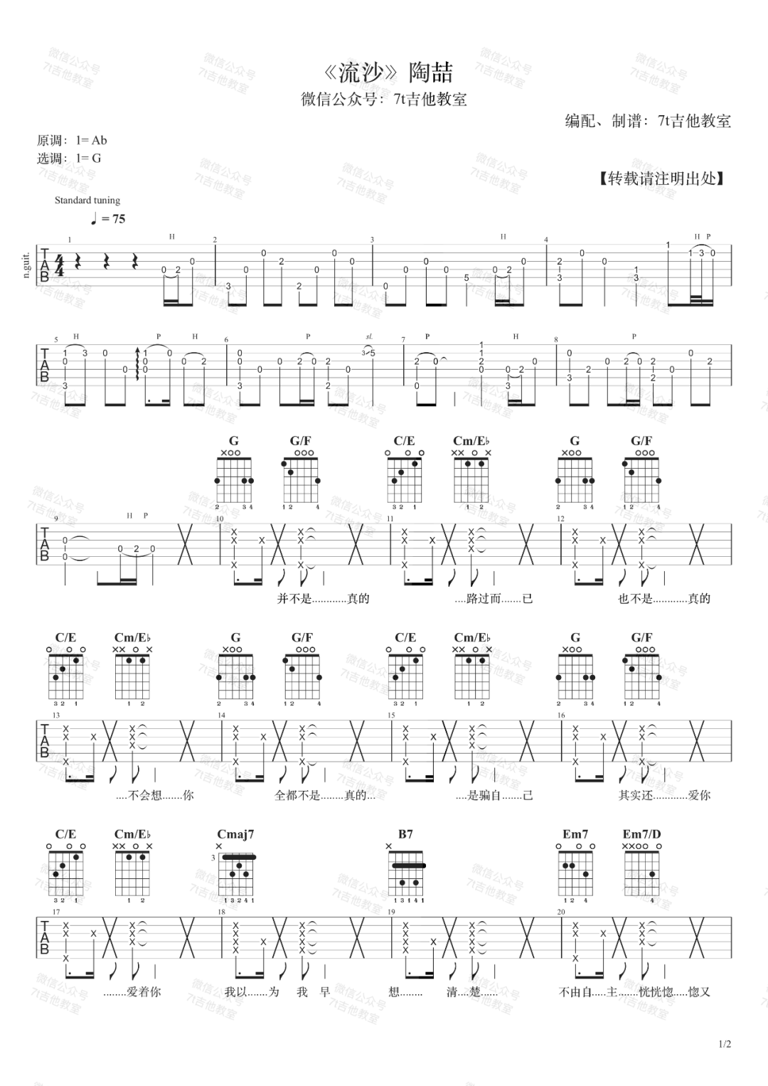 曲谱介绍: 吉他谱介绍:流沙吉他谱,陶喆演唱的一首歌曲,4/4拍的节奏,这首歌曲的原调为降A调,这里曲谱采用了G调指法进行编配,演唱时夹变调夹1品可回到原调,也可根据个人实际嗓音情况选择。曲谱由琴谱网更新上传,共2张高清图片弹唱吉他谱例,来源于@7T吉他教室编配出品。