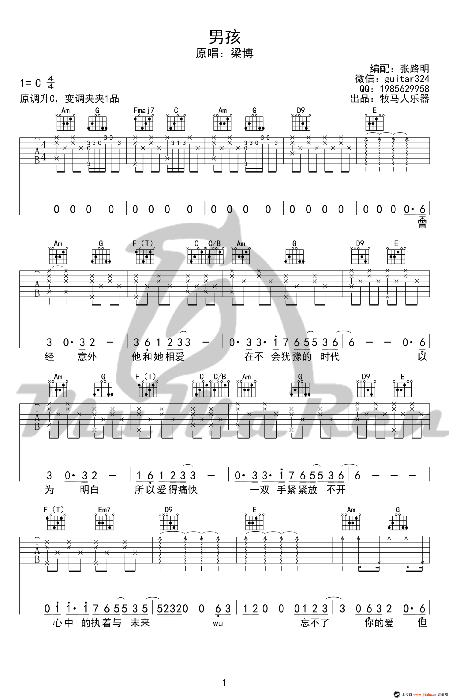 曲谱介绍: 梁博《男孩》吉他谱,原调升C,变调夹夹一品,C调指法编配。《中国好声音》全国总冠军梁博,在一夜爆红后自己选择了沉淀,如今推出原创歌曲《男孩》,本曲谱为吉他版,把挣扎、无奈和遗憾的呐喊化为温柔的倾诉,一样动人。