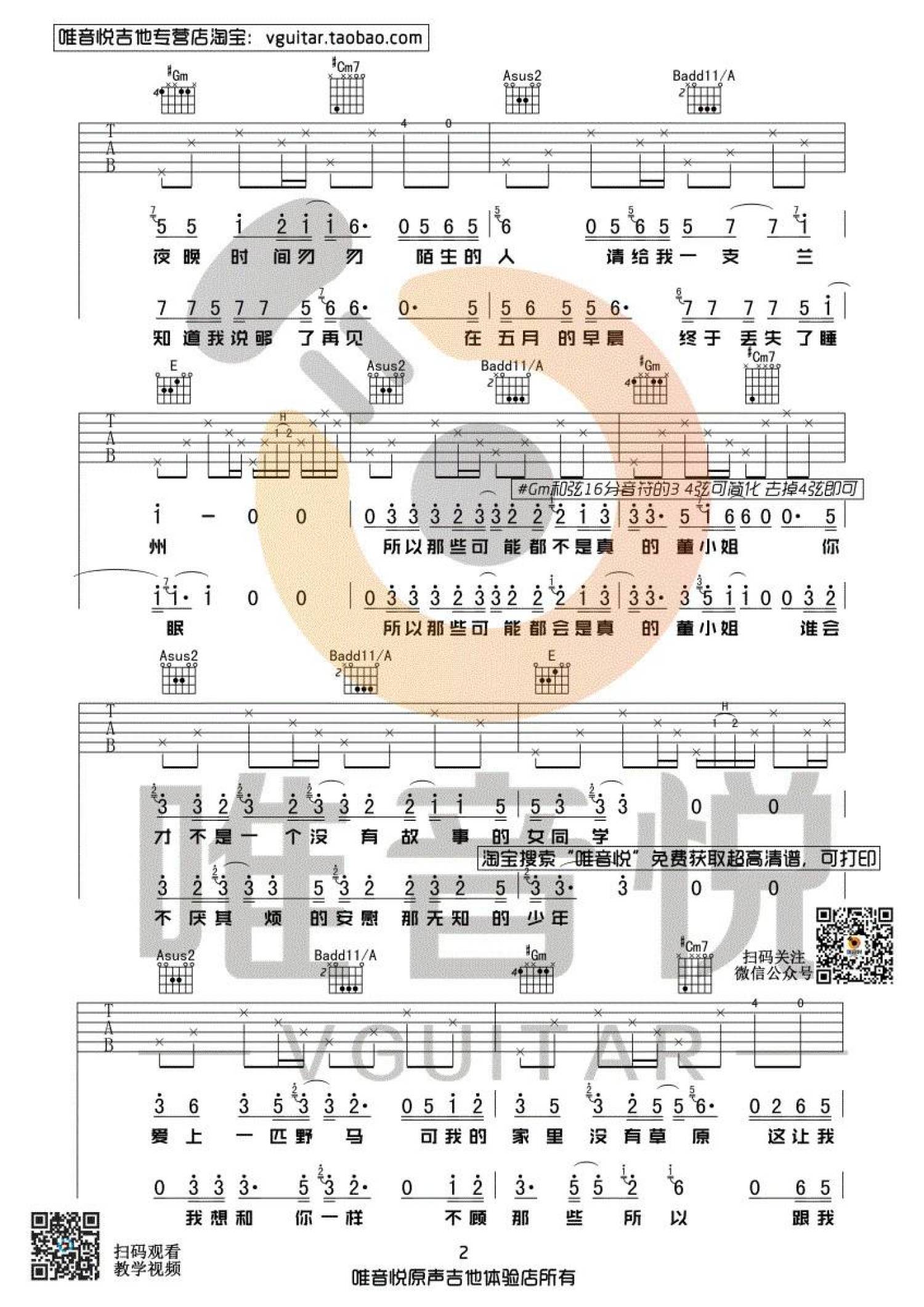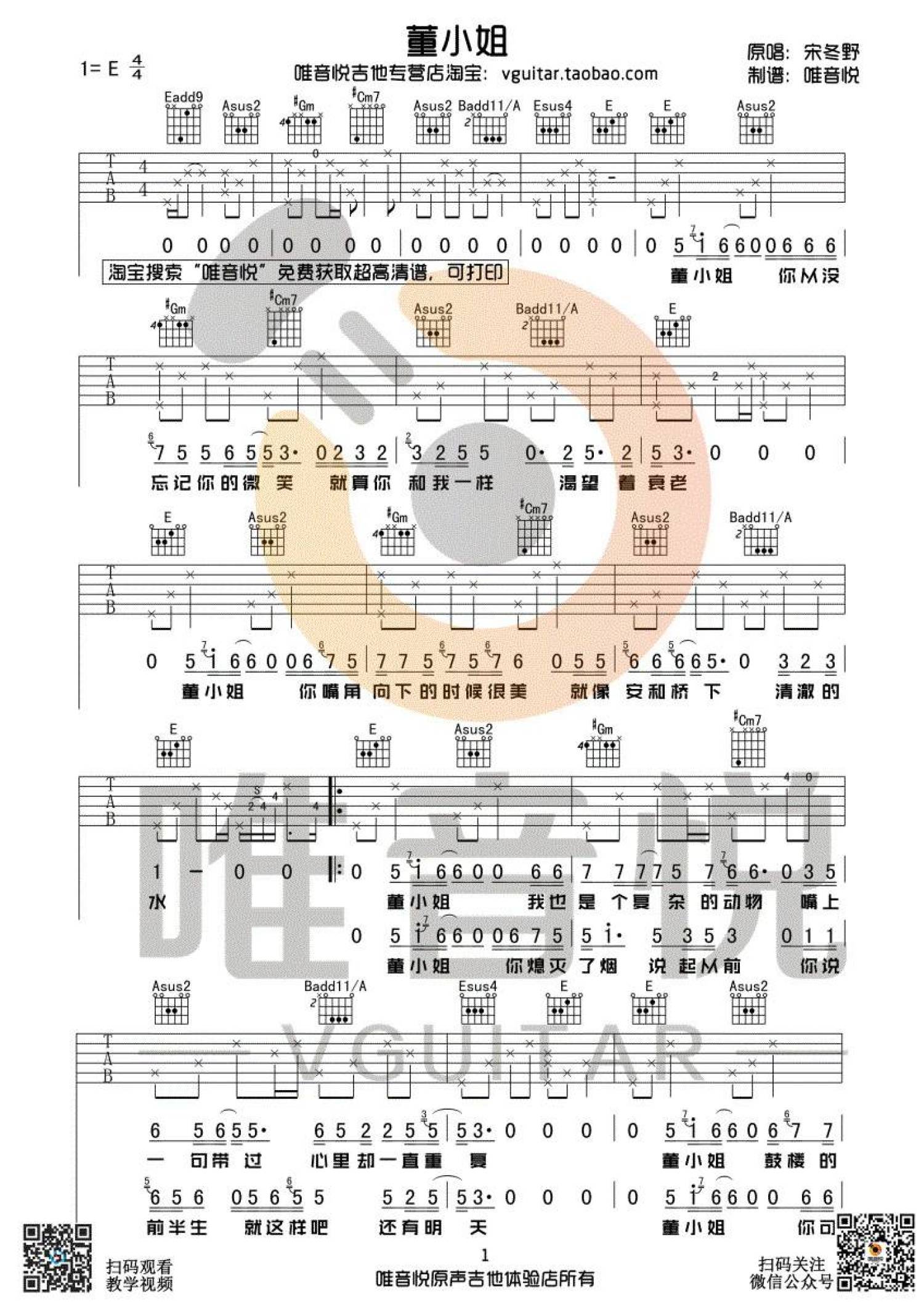 曲谱介绍: 宋冬野《董小姐》吉他谱_E调吉他弹唱谱