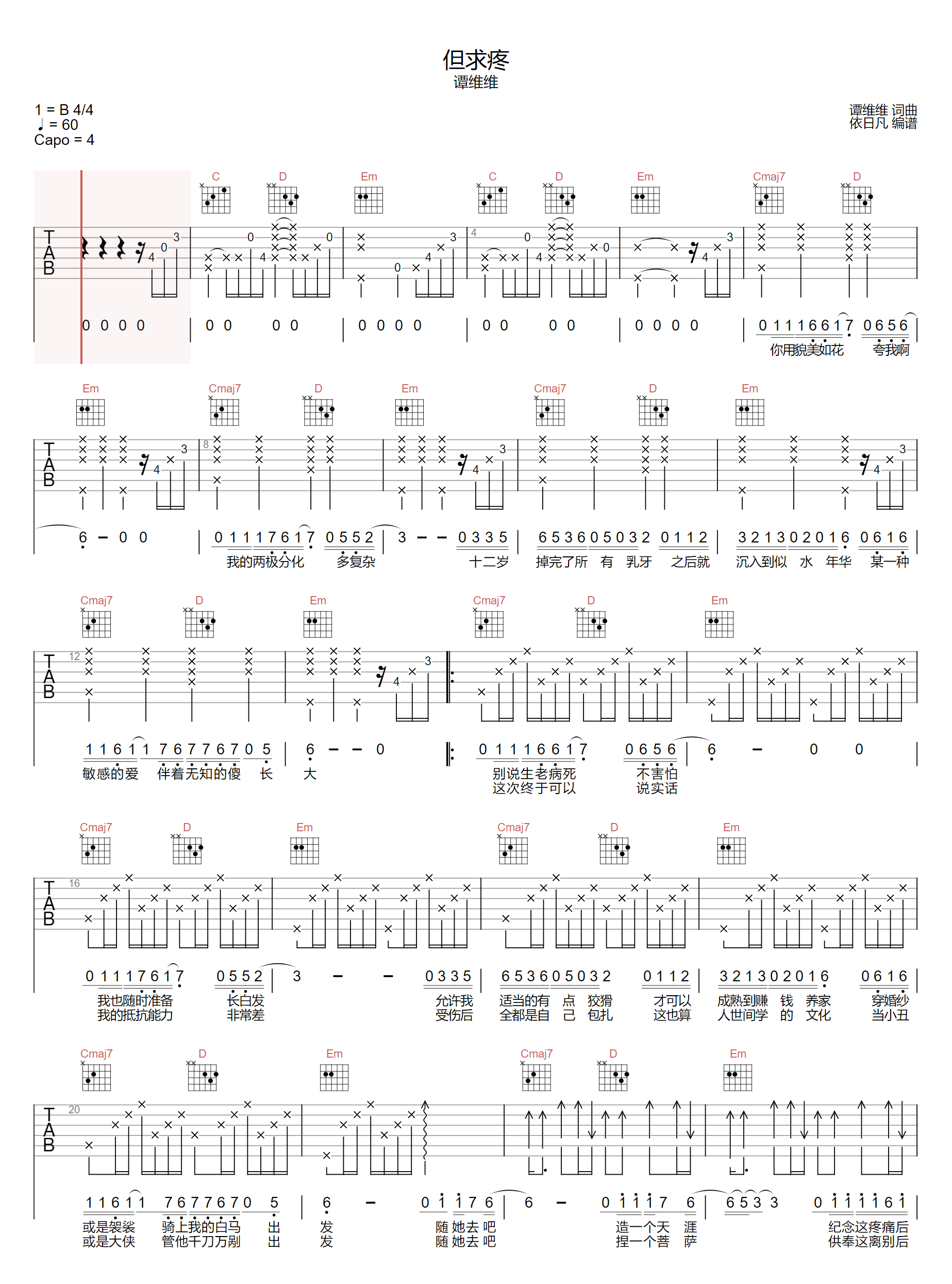 曲谱介绍: 吉他谱介绍:但求疼吉他谱,谭维维演唱的一首歌曲,4/4拍的节奏,这首歌曲的原调为B调,这里曲谱采用了G调指法进行编配,演唱时夹变调夹4品可回到原调,也可根据个人实际嗓音情况选择。曲谱由琴谱网更新上传,共3张高清图片弹唱吉他谱例,来源于@依日凡编配出品。这首歌歌词写得很好,词曲里有现实、挣扎、呐喊,谭维维唱得很好,完美表达词曲的含义,舞台设计与歌词的适配度满分。