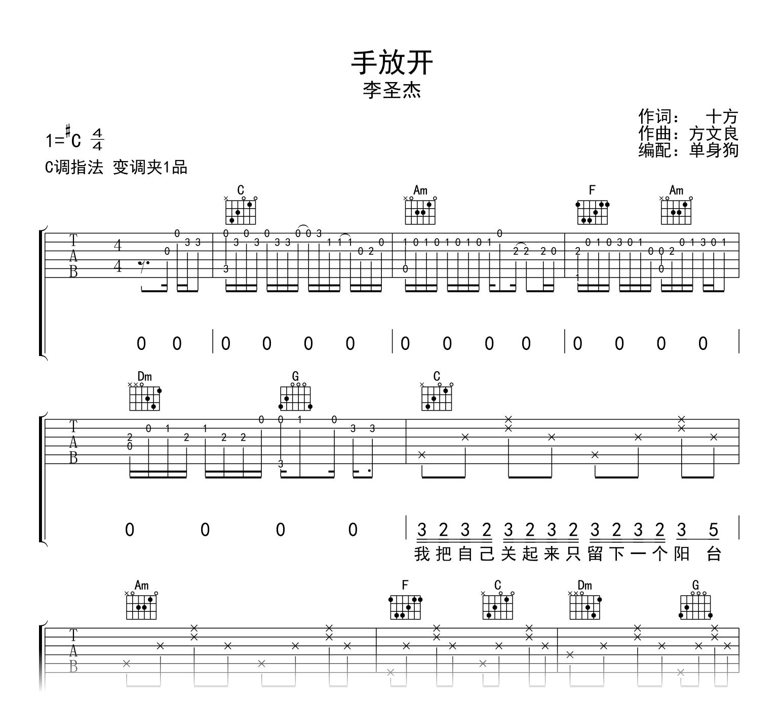 曲谱介绍: 李圣杰《手放开》吉他弹唱谱,采用C调指法编配,共有2张高清图谱,免翻页排版设计。