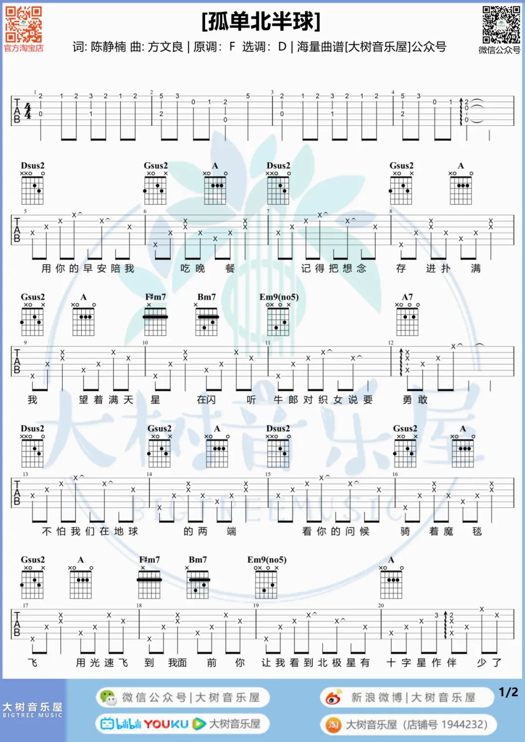 曲谱介绍: 吉他谱介绍:孤单北半球吉他谱,欧得洋演唱的一首歌曲,4/4拍的节奏,这首歌曲的原调为F调,这里曲谱采用了D调指法进行编配,演唱时夹变调夹3品可回到原调,也可根据个人实际嗓音情况选择。曲谱由琴谱网更新上传,共2张高清图片弹唱吉他谱例,来源于@大树音乐屋编配出品。多年前的一首经典老情歌,现在听起来还是那么的有感觉,经典始终是经典。 孤单北半球吉他弹唱教学