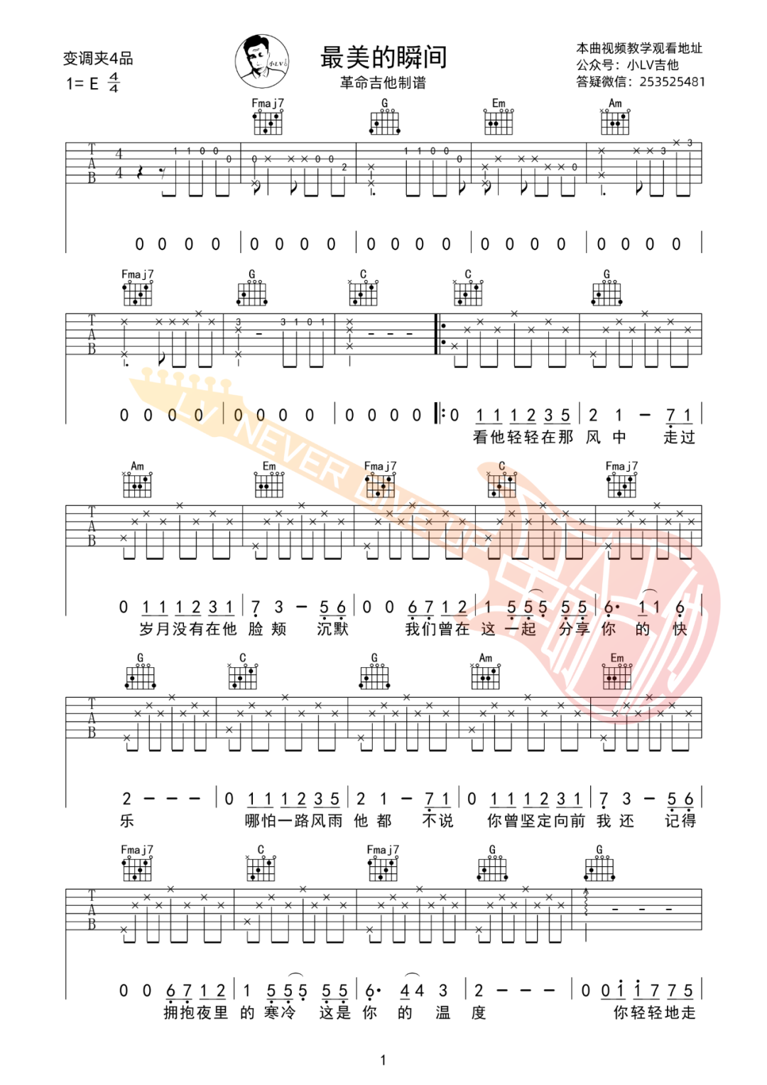 曲谱介绍: 吉他谱介绍:最美的瞬间吉他谱,真瑞演唱的一首歌曲,4/4拍的节奏,这首歌曲的原调为E调,这里曲谱采用了C调指法进行编配,演唱时夹变调夹4品可回到原调,也可根据个人实际嗓音情况选择。曲谱由琴谱网更新上传,共3张高清图片弹唱吉他谱例,来源于@革命吉他编配出品。“你静静的走过在风雨花丛中”因为这句歌词,也因为有些事情,现在听到这歌总感觉有点伤感,或许是宅在家里的日子沉重了原本轻松的心灵,又或许是那个蝴蝶结女孩的故事触动了我,最美好的瞬间就好像是刺痛你内心时候的那一抹遗憾。 最美的瞬间吉他弹唱教学