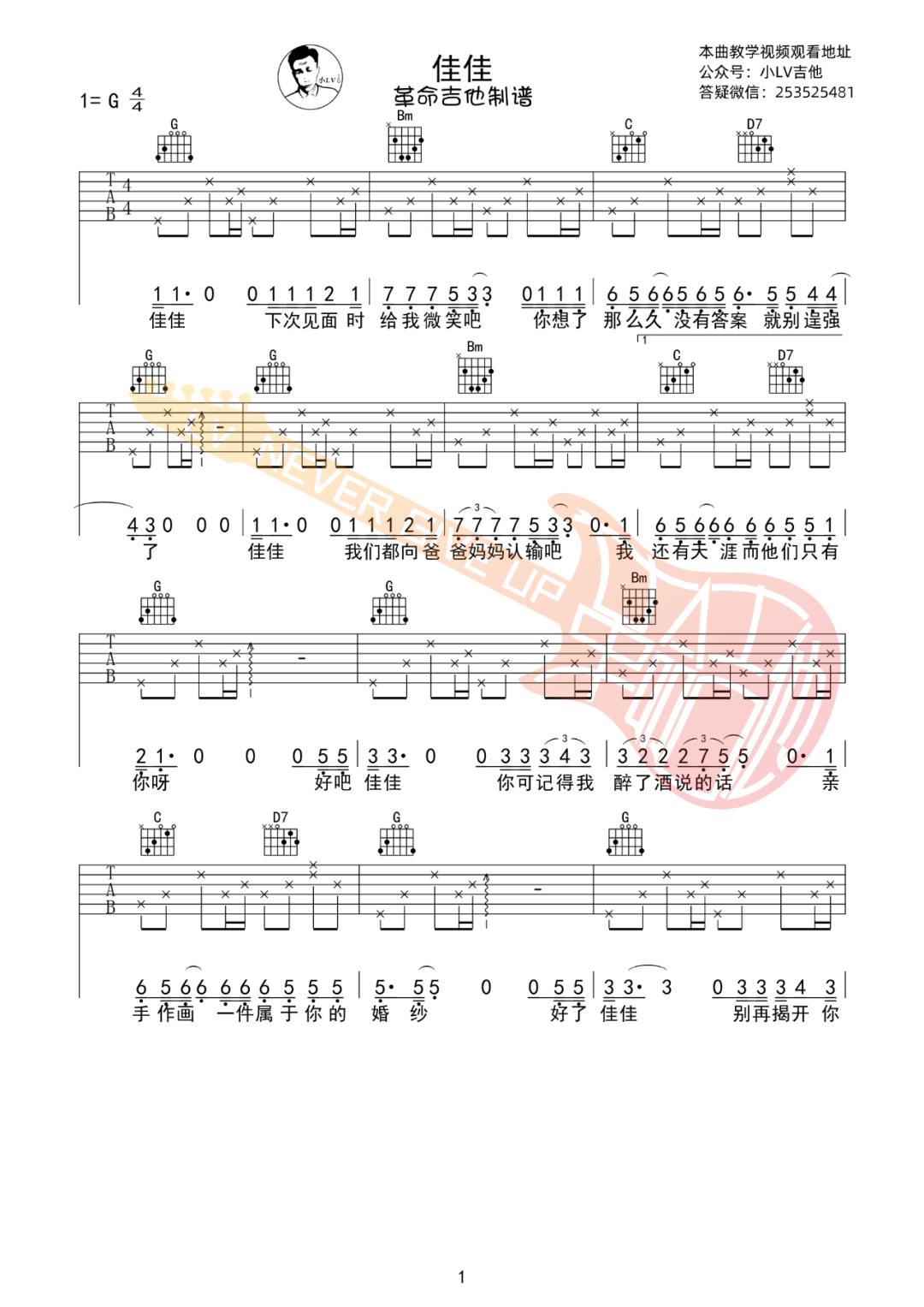 佳佳吉他谱 - 张晏铭 - G调吉他弹唱谱