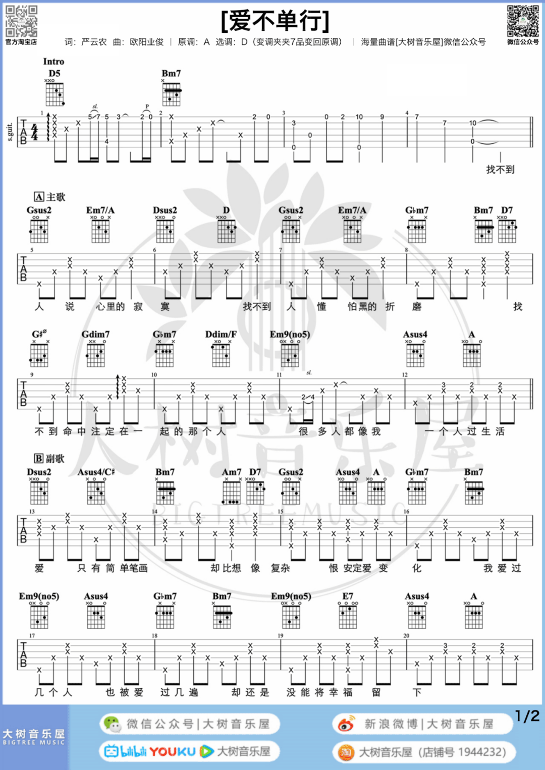 曲谱介绍: 吉他谱介绍:爱不单行吉他谱,罗志祥演唱的一首歌曲,4/4拍的节奏,这首歌曲的原调为A调,这里曲谱采用了D调指法进行编配,演唱时可根据个人情况选择变调夹,曲谱由琴谱网更新上传,共3张高清图片弹唱吉他谱例,来源于@大树音乐屋编配出品。听惯罗志祥快节奏歌曲的听众试着去听这种慢板抒情歌,就好像刚喝下一杯火辣热情的伏加特之后马上喝一口清新温软的铁观音一般,有种独特的滋味。 爱不单行吉他弹唱教学