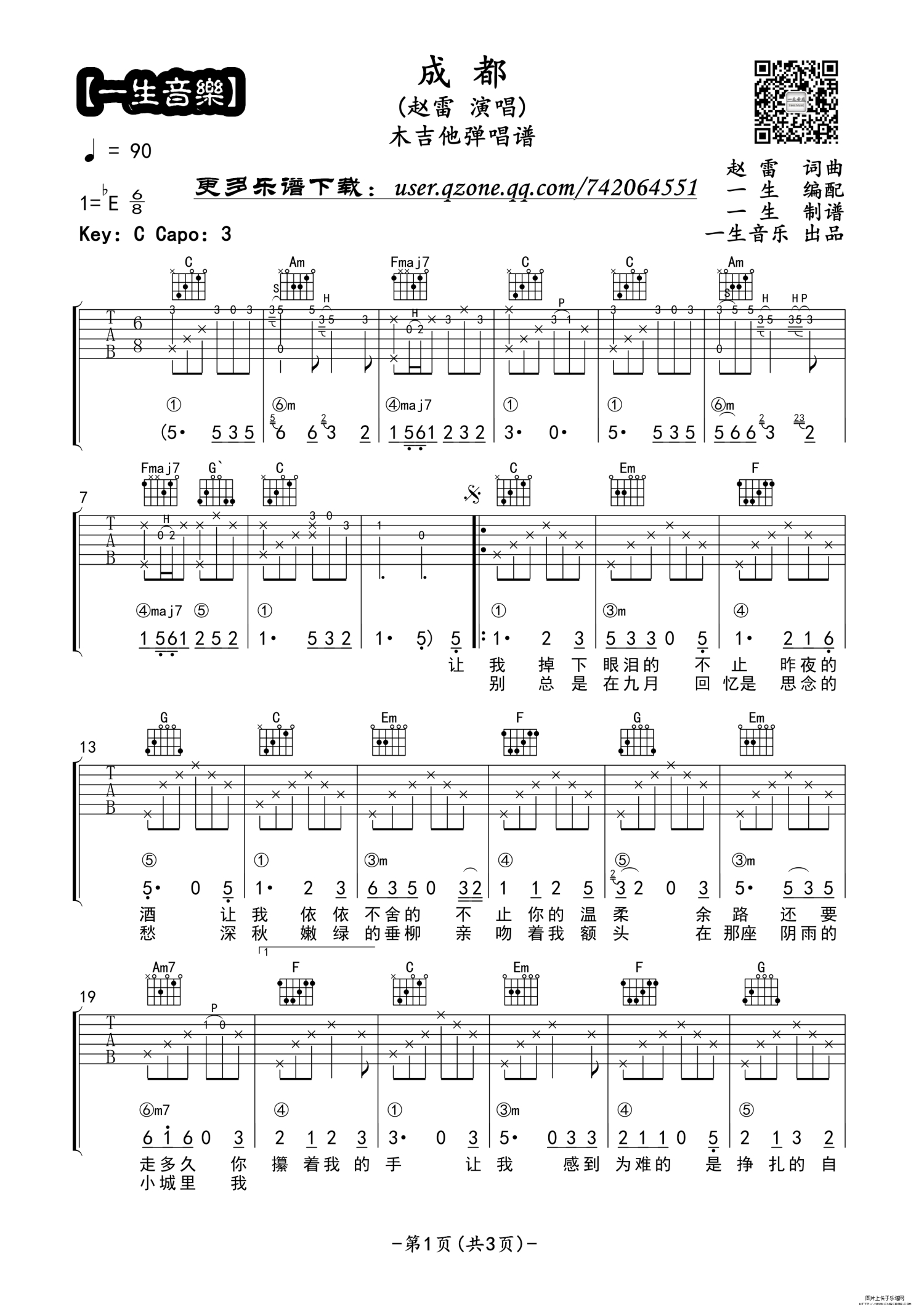 曲谱介绍: 赵雷《成都》吉他谱_C调吉他弹唱谱