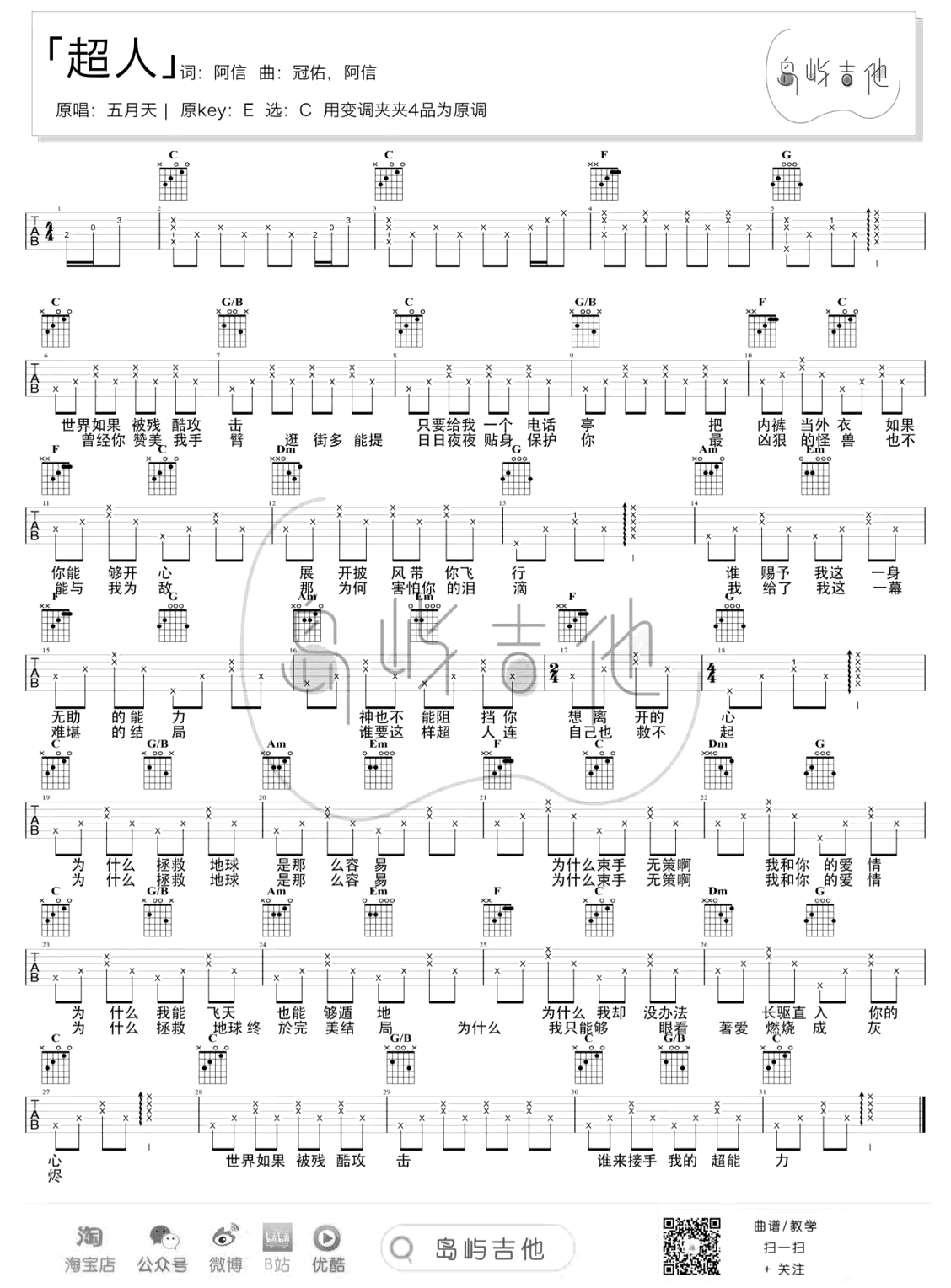 超人吉他谱 - 五月天 - C调吉他弹唱谱