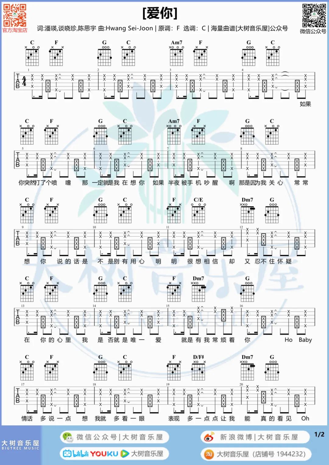曲谱介绍: 吉他谱介绍:爱你吉他谱,王心凌演唱的一首歌曲,4/4拍的节奏,这首歌曲的原调为F调,这里曲谱采用了C调指法进行编配,演唱时夹变调夹5品可回到原调,也可根据个人实际嗓音情况选择。曲谱由琴谱网更新上传,共2张高清图片弹唱吉他谱例,来源于@大树音乐屋编配出品。 爱你吉他弹唱教学